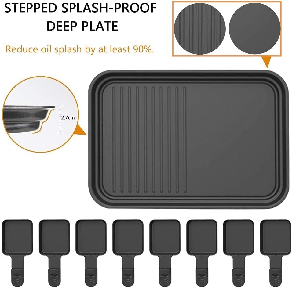 • Незалепваща плоча за грил - Стъпаловидният дизайн може ефективно да предотврати изтичане на масло, поддържайки тигана и масата чисти. Електрическата раклет скара е незалепваща плоча за грил, която се нуждае само от малко масло.