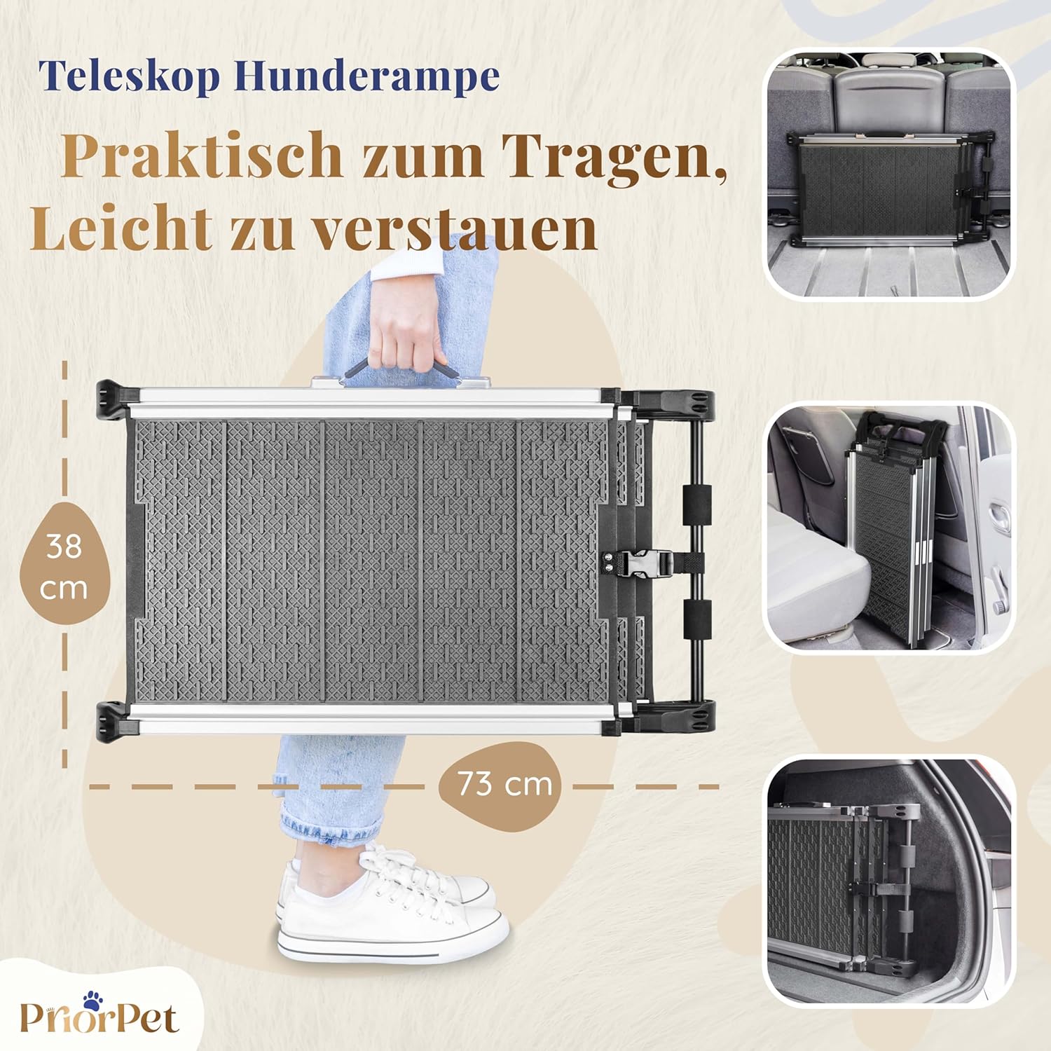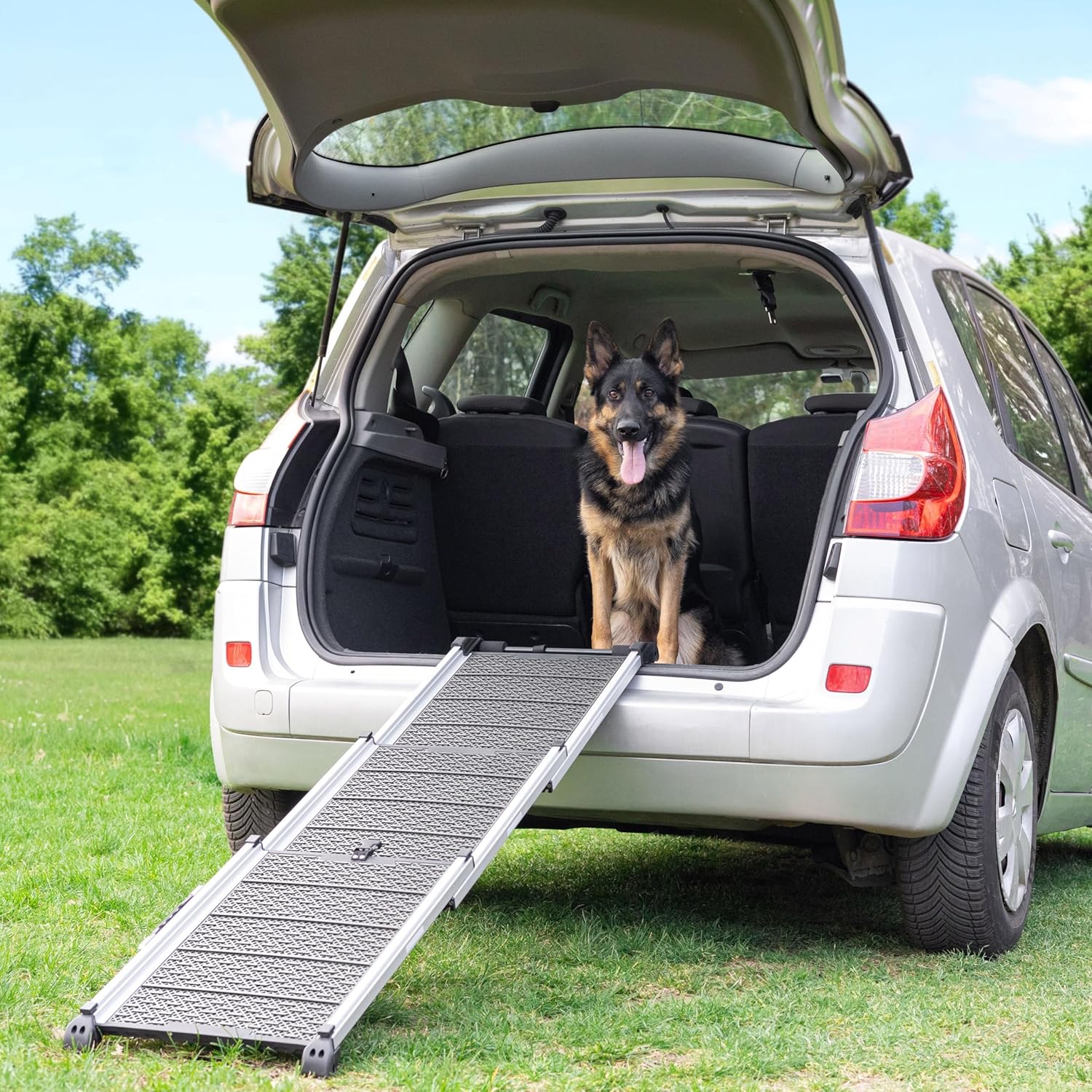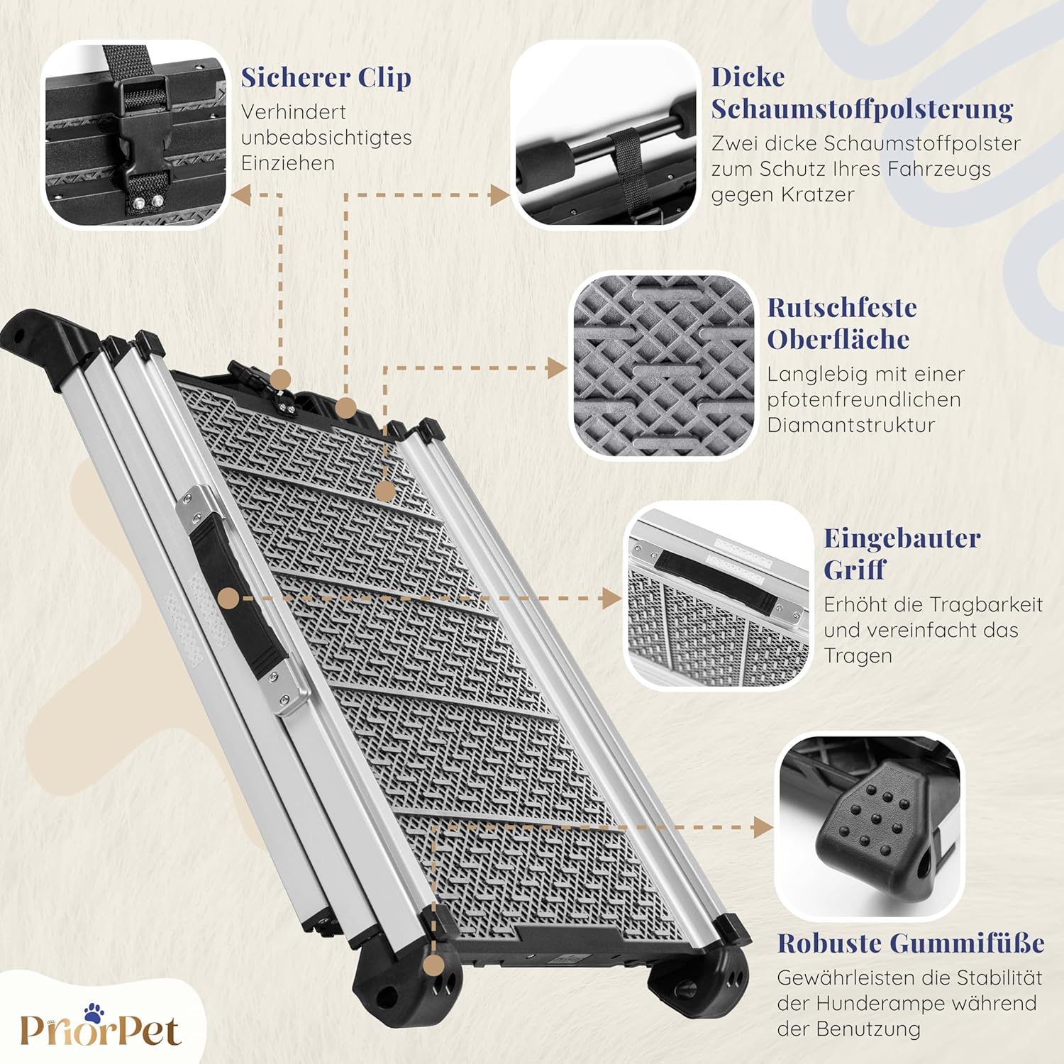 • Прибиращ се компактен дизайн: тази алуминиева рампа за кучета е прибираща се и предлага решение за пестене на място. Универсалният дизайн на рампата за кучета се адаптира към различни размери превозни средства.