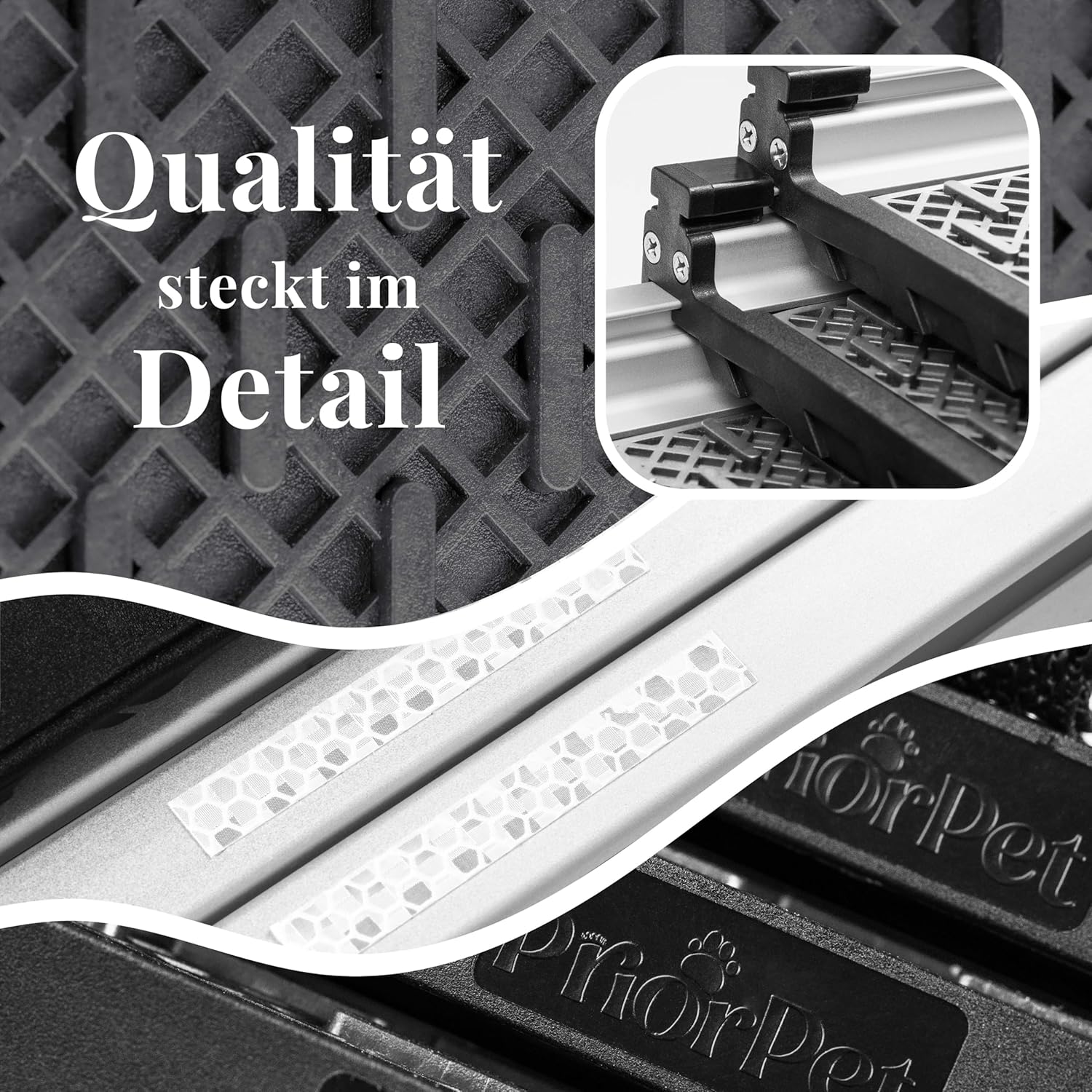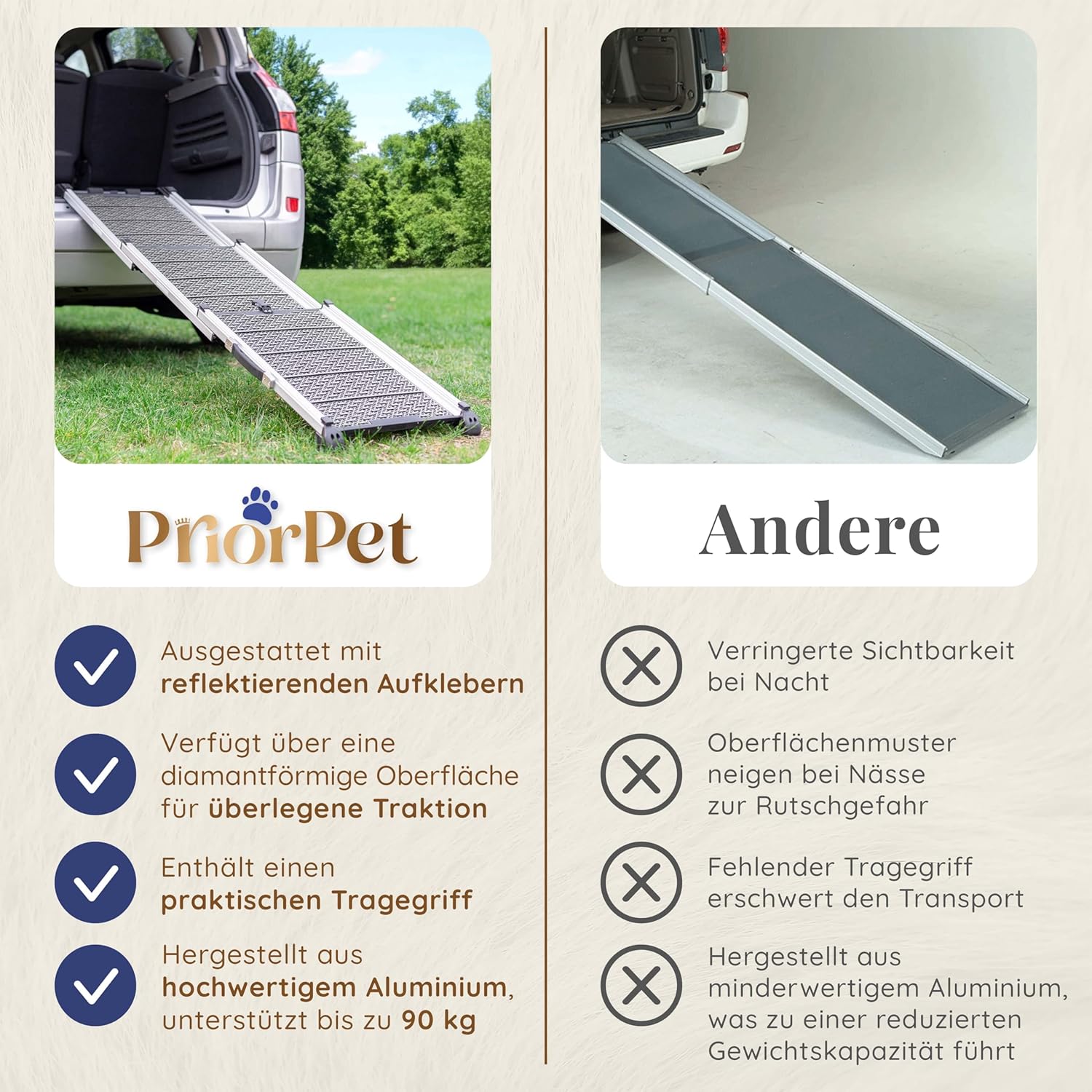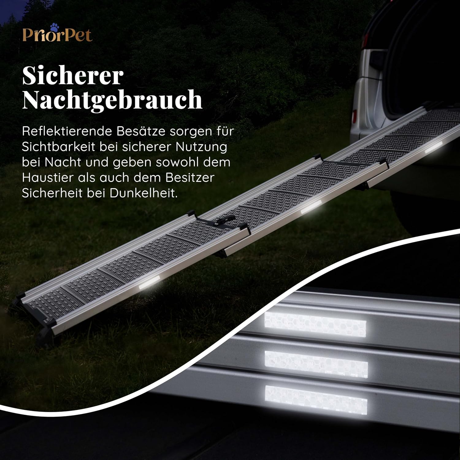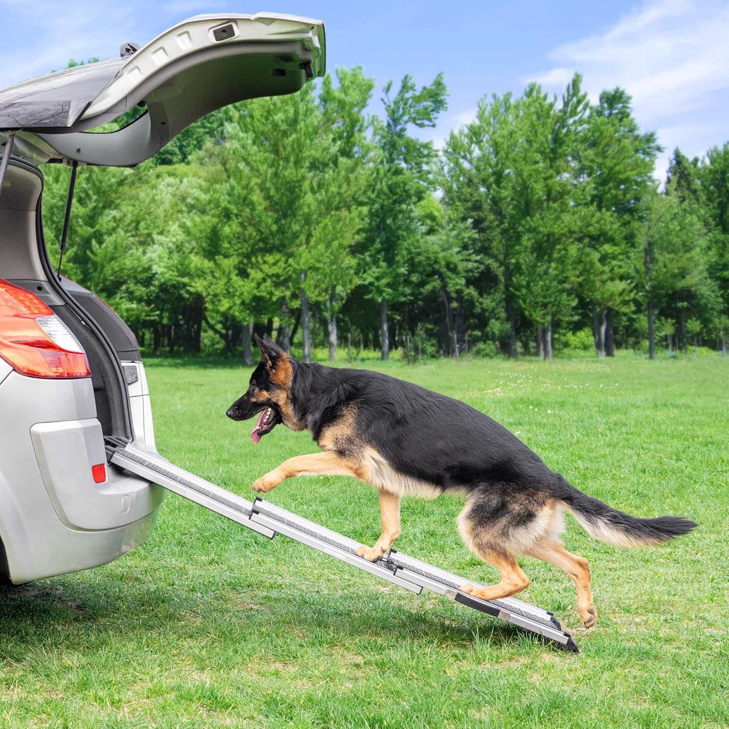 • Прибиращ се компактен дизайн: тази алуминиева рампа за кучета е прибираща се и предлага решение за пестене на място. Универсалният дизайн на рампата за кучета се адаптира към различни размери превозни средства.