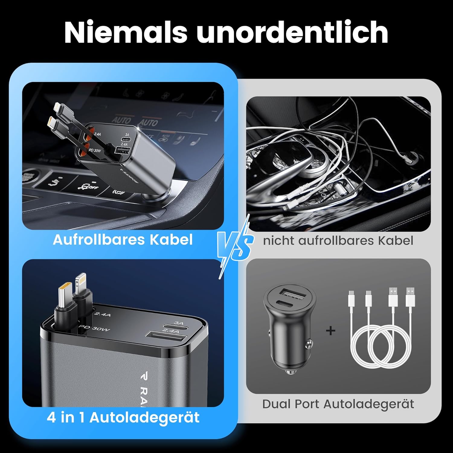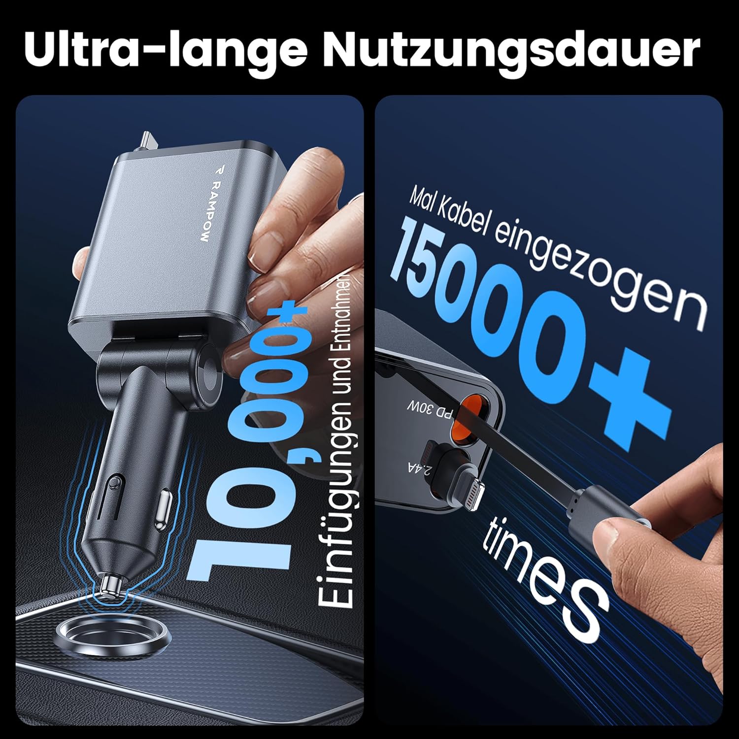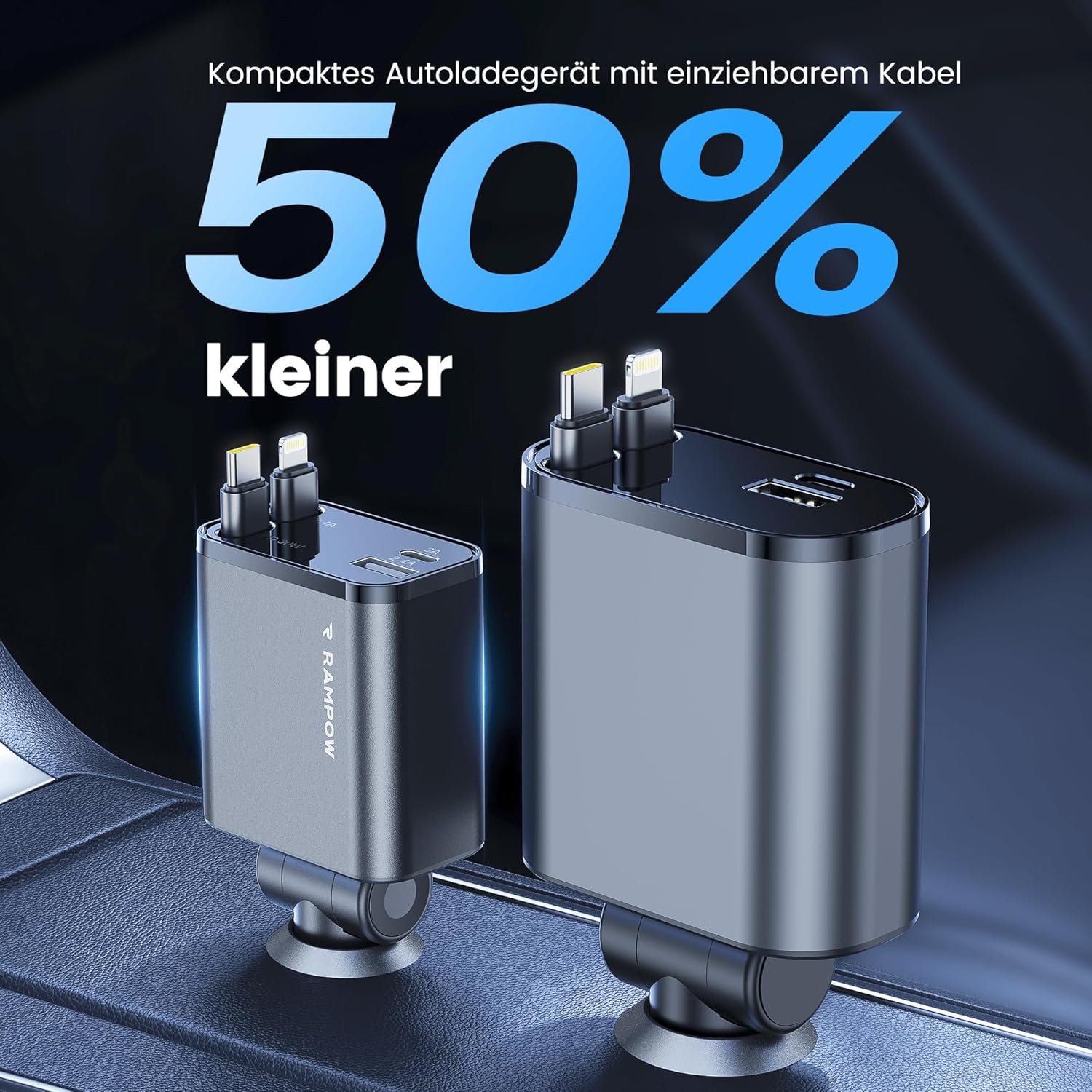 • [50% по-малък] С обновен дизайн, като автомобилен аксесоар, прибиращото се зарядно за кола RAMPOW е с 50% по-малко от другите, спестявайки повече място в колата ви.