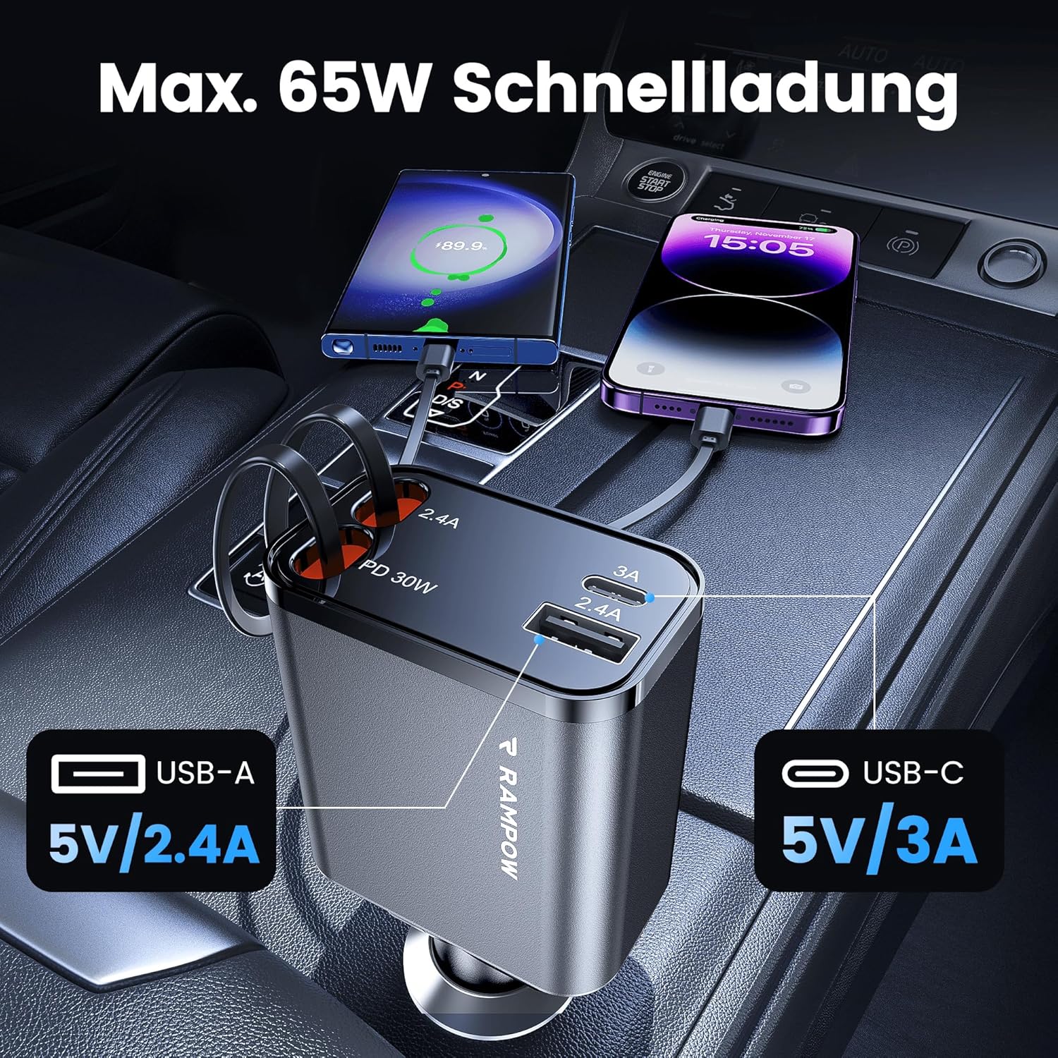 • [4-в-1 прибиращо се зарядно за кола 65W] С USB-C порт и USB-A порт, това 4-в-1 прибиращо се зарядно за кола може безопасно да зарежда до четири устройства едновременно. С бързо зареждане PD3.0 30W, то може да зарежда устройства от 0 до 80% само за 30 минути. Оборудвано с висококачествени чипове, които осигуряват защита от претоварване по ток и късо съединение, това зарядно устройство гарантира безопасно зареждане, без да поврежда вашите устройства.