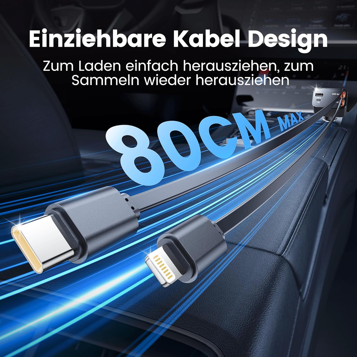 • [Прибиращ се дизайн] Това прибиращо се зарядно за кола се предлага с Type-C кабел и Lightning кабел и позволява гъвкаво удължаване до 80 см/31,5 инча. Като автомобилен аксесоар, то се прибира автоматично за удобно съхранение, елиминира заплетените кабели и осигурява подреден интериор на автомобила.