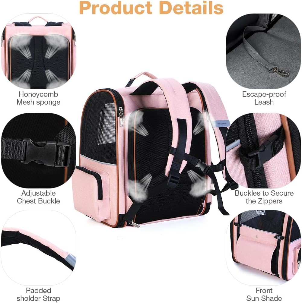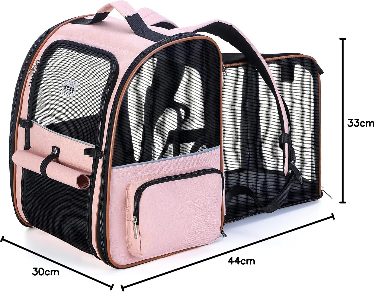 Раницата за котки е с размери приблизително 32 x 28,4 x 42 (Диаметър и Височина). Максималната товароносимост е 8 кг. Побира 1 котка / 2 котенца или зайци до 8 кг; подходяща за малки или средни кучета до 6 кг.