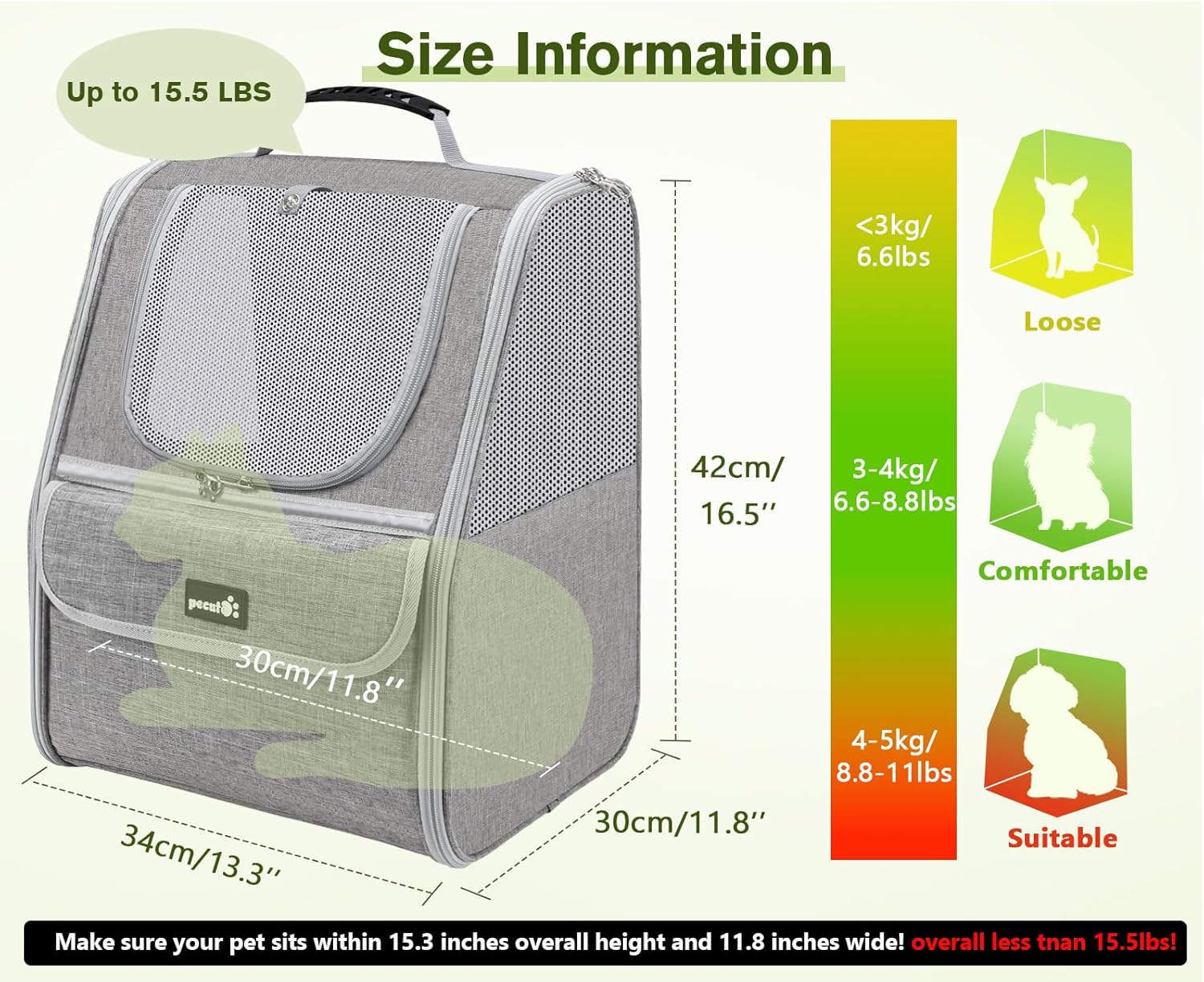 • Спецификации на продукта: Размер: ширина 34 см x дълбочина 42 см x височина 43 см. Тегло на продукта: приблизително 0,9 кг. Препоръчителна употреба за домашни любимци под 6 кг и височина на седалката под 40 см: малки кучета, котки, зайци и дребни животни. *Препоръчителната употреба е само за справка. Моля, изберете действителния размер на вашия домашен любимец при покупка.