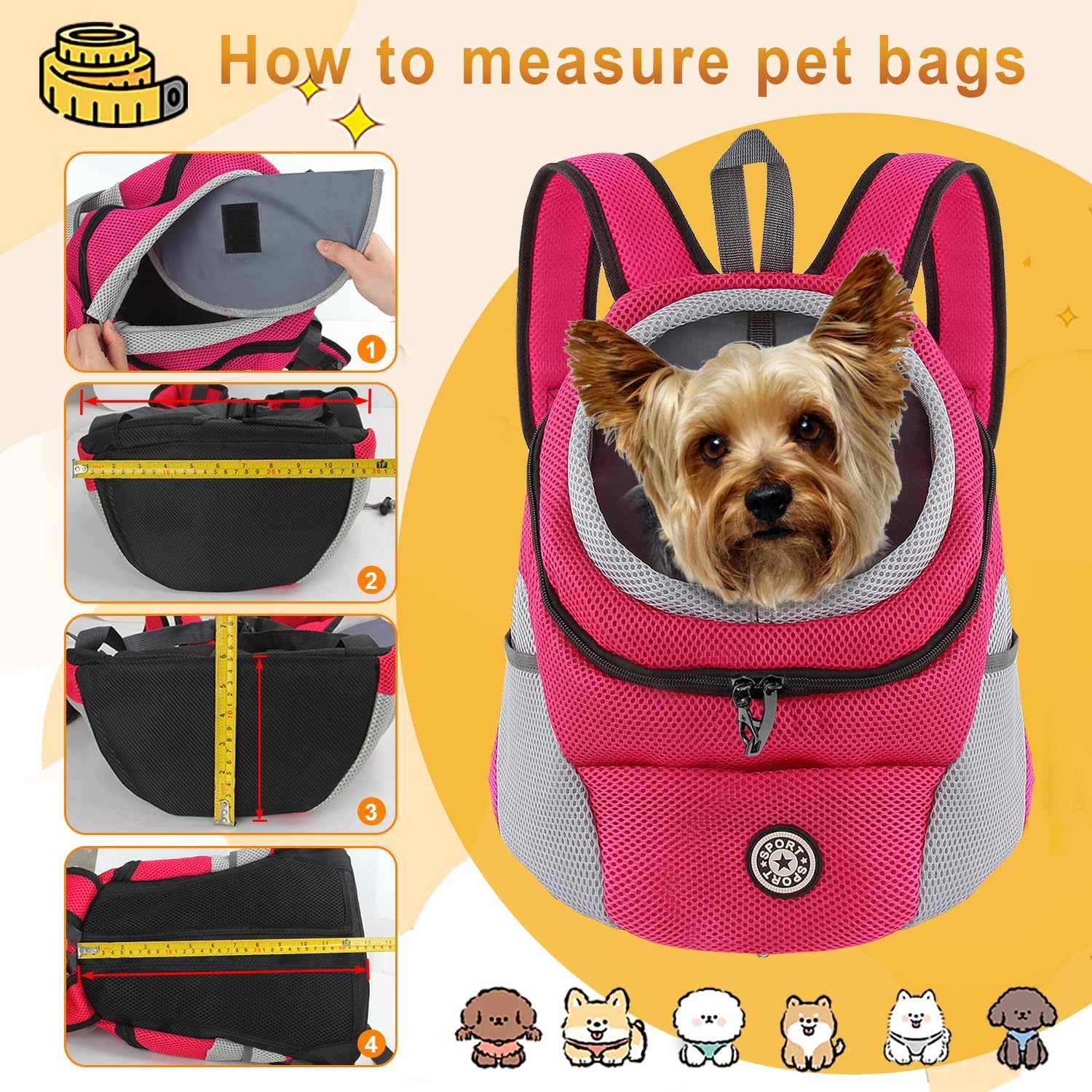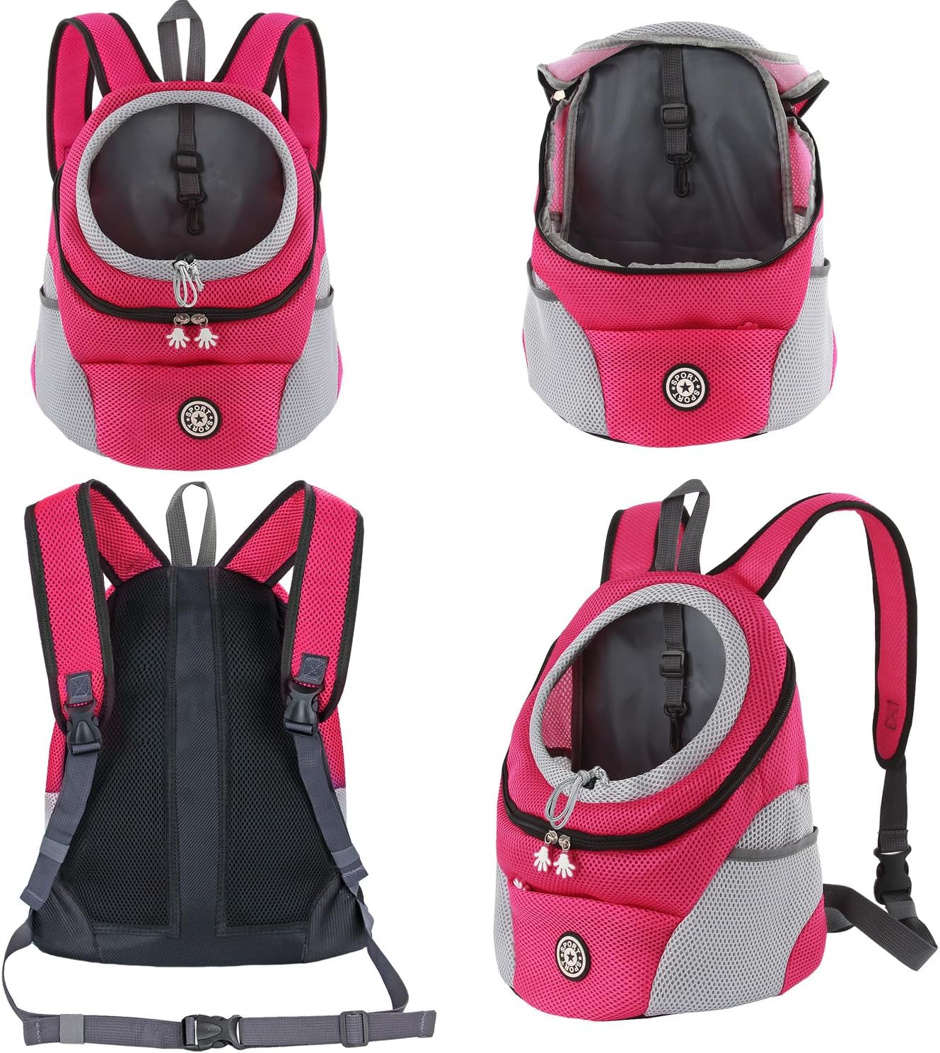 • Дизайн с мрежеста вентилация: материалът е полиестерно влакно и дишаща, лека мрежа, горният вход с цип позволява лесен достъп. Раницата за кучета има 3 мрежести джоба, страничните и предните джобове позволяват съхранение на каишка, вода, закуски, лакомства и други.