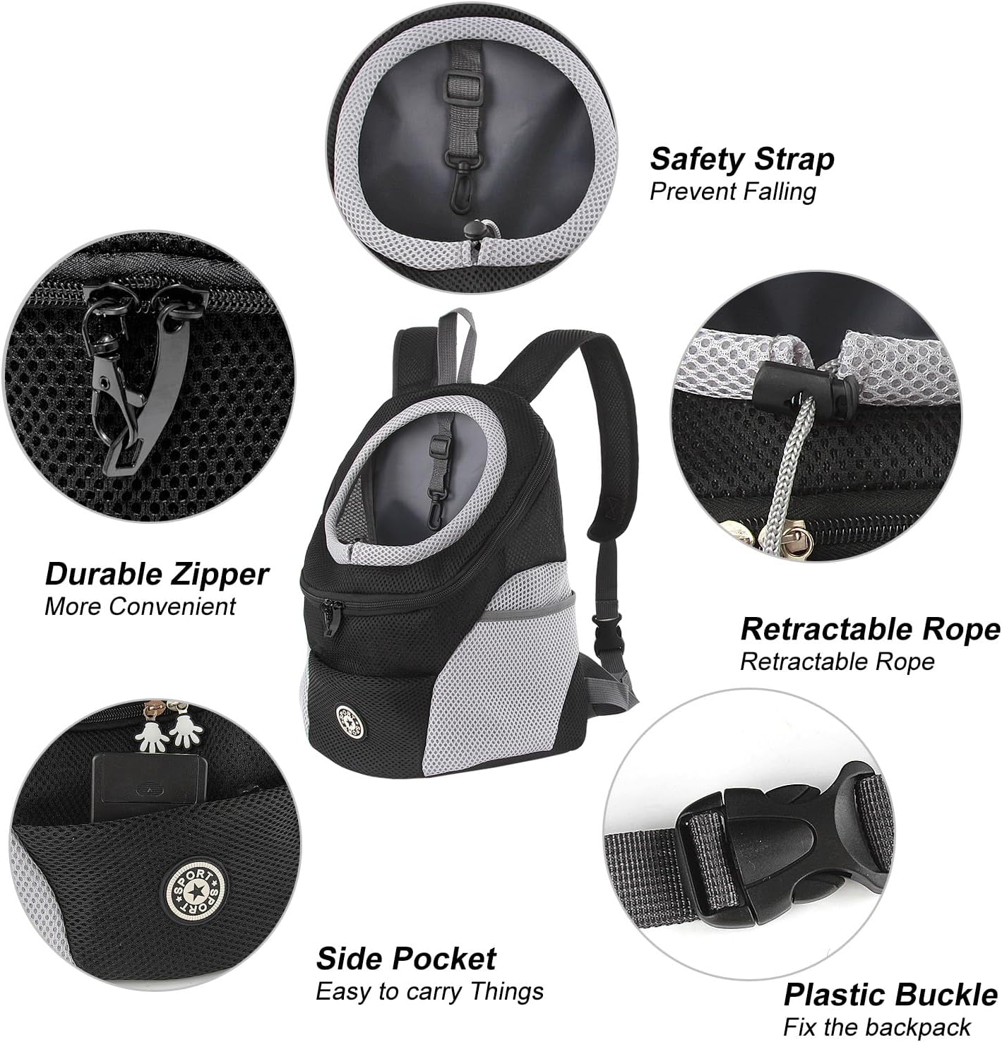 • Регулируеми презрамки и шнур: регулируемите, леки, подплатени презрамки на раницата спомагат за намаляване на натиска. Разтегателният колан за кръста с катарама държи раницата стабилна и безопасна. Вътрешното въже с щипка може да се свърже с нагръдника на вашия домашен любимец, за да се предотврати скачането или нараняването на кучето и котето.