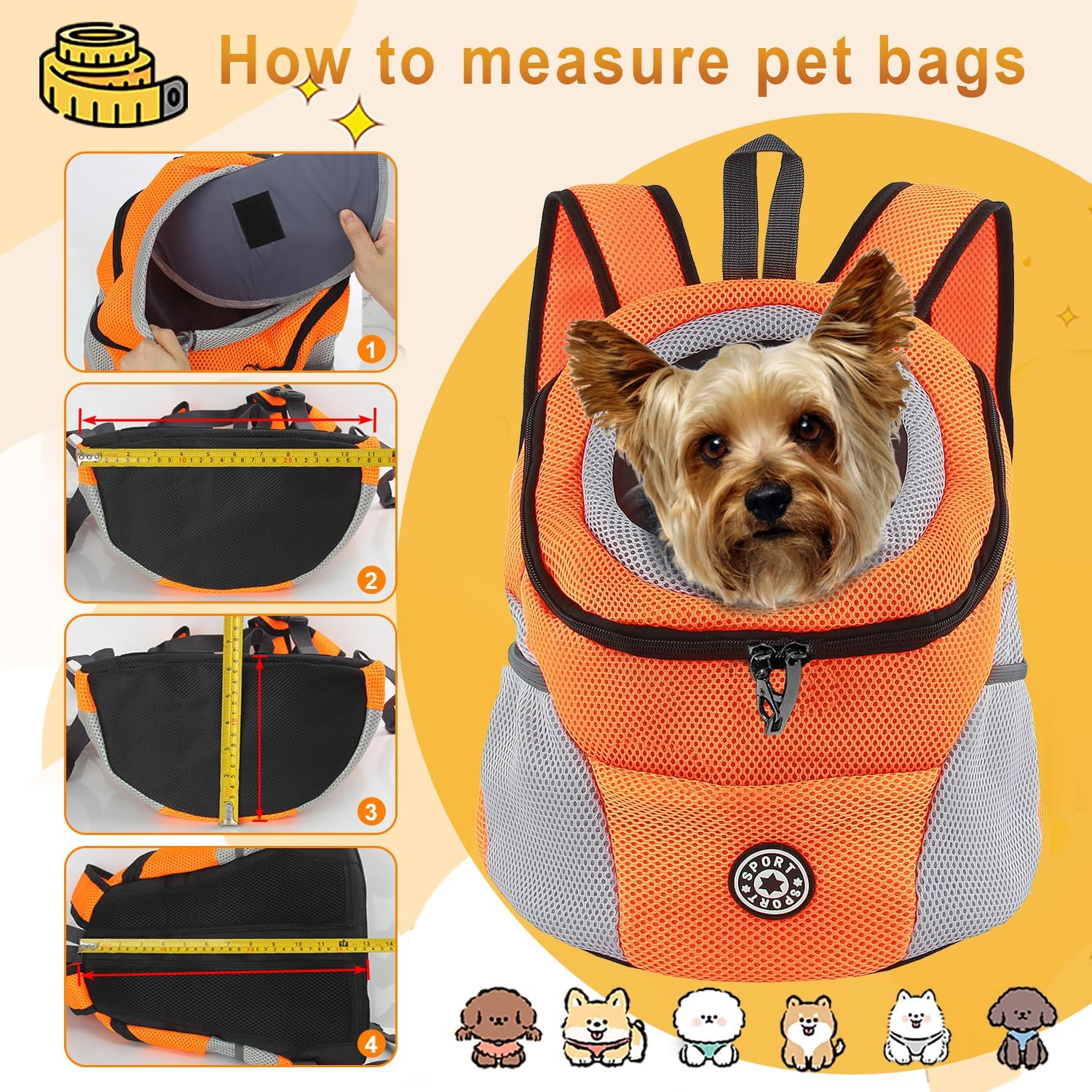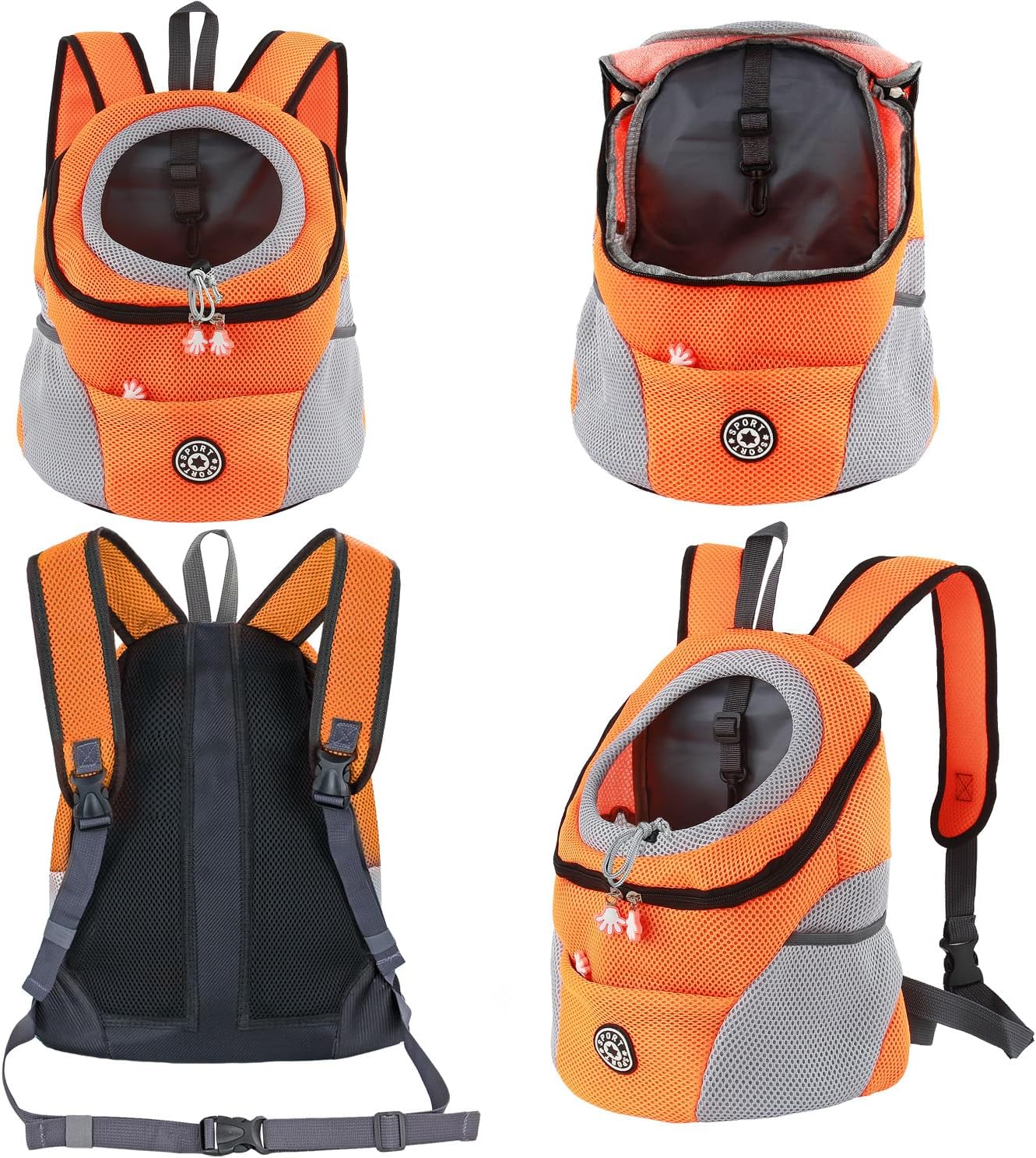 • Дизайн с мрежеста вентилация: материалът е полиестерно влакно и дишаща, лека мрежа, горният вход с цип позволява лесен достъп. Раницата за кучета има 3 мрежести джоба, страничните и предните джобове позволяват съхранение на каишка, вода, закуски, лакомства и други.