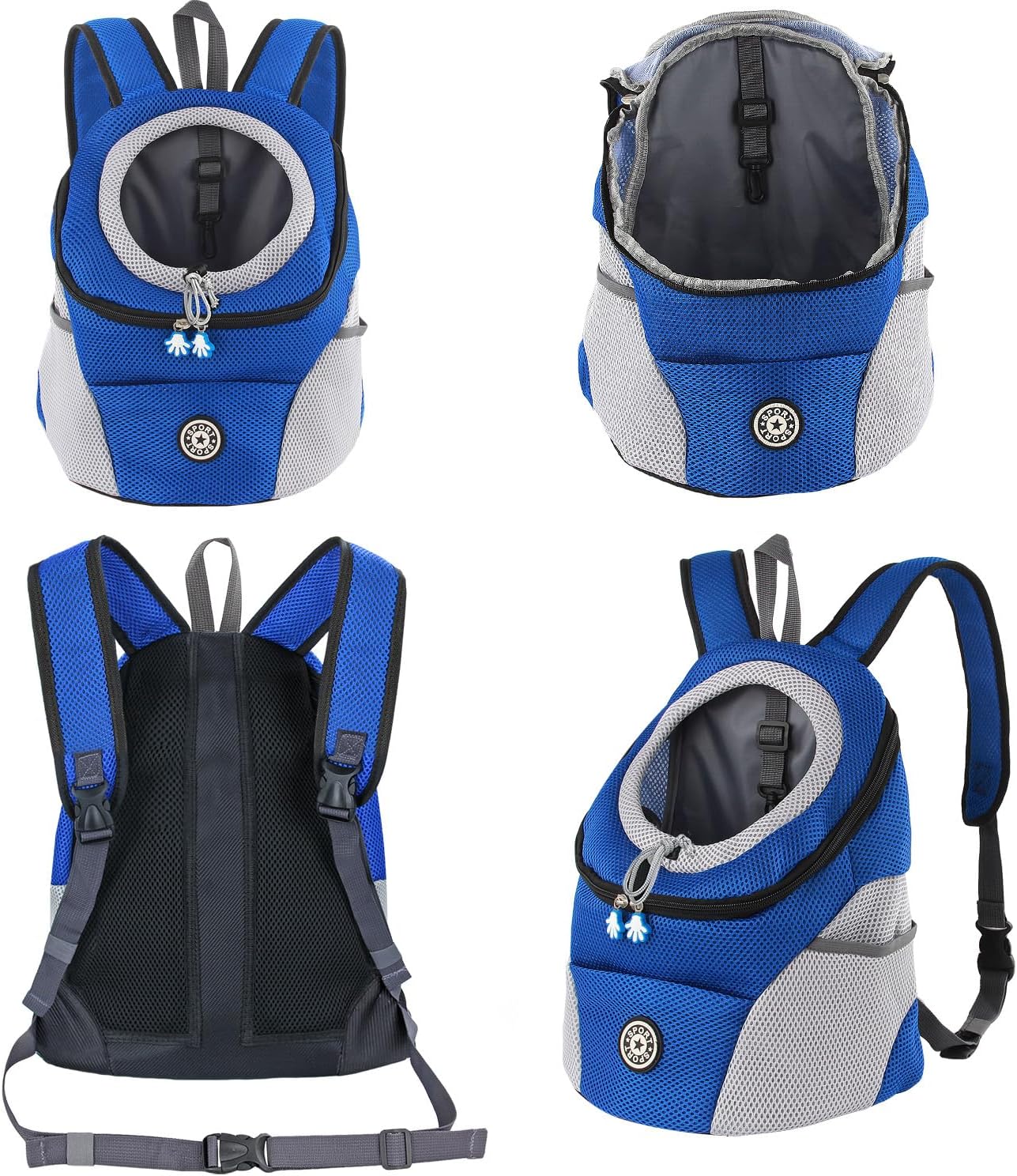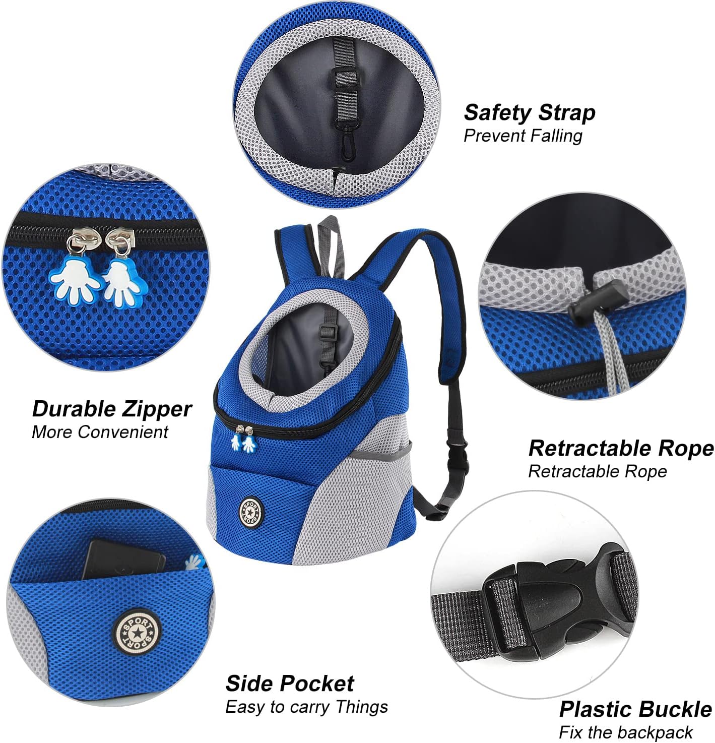 • Дизайн с мрежеста вентилация: материалът е полиестерно влакно и дишаща, лека мрежа, горният вход с цип позволява лесен достъп. Раницата за кучета има 3 мрежести джоба, страничните и предните джобове позволяват съхранение на каишка, вода, закуски, лакомства и други.