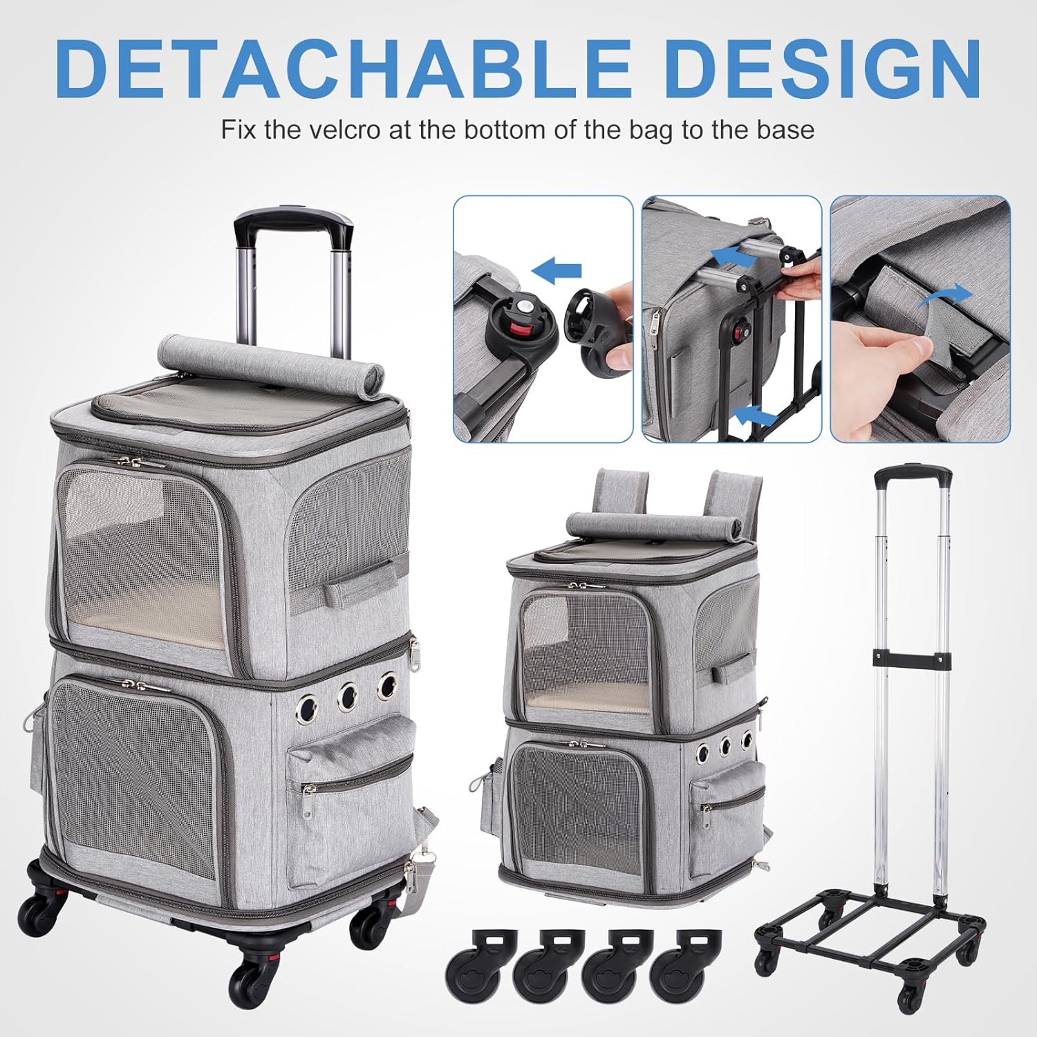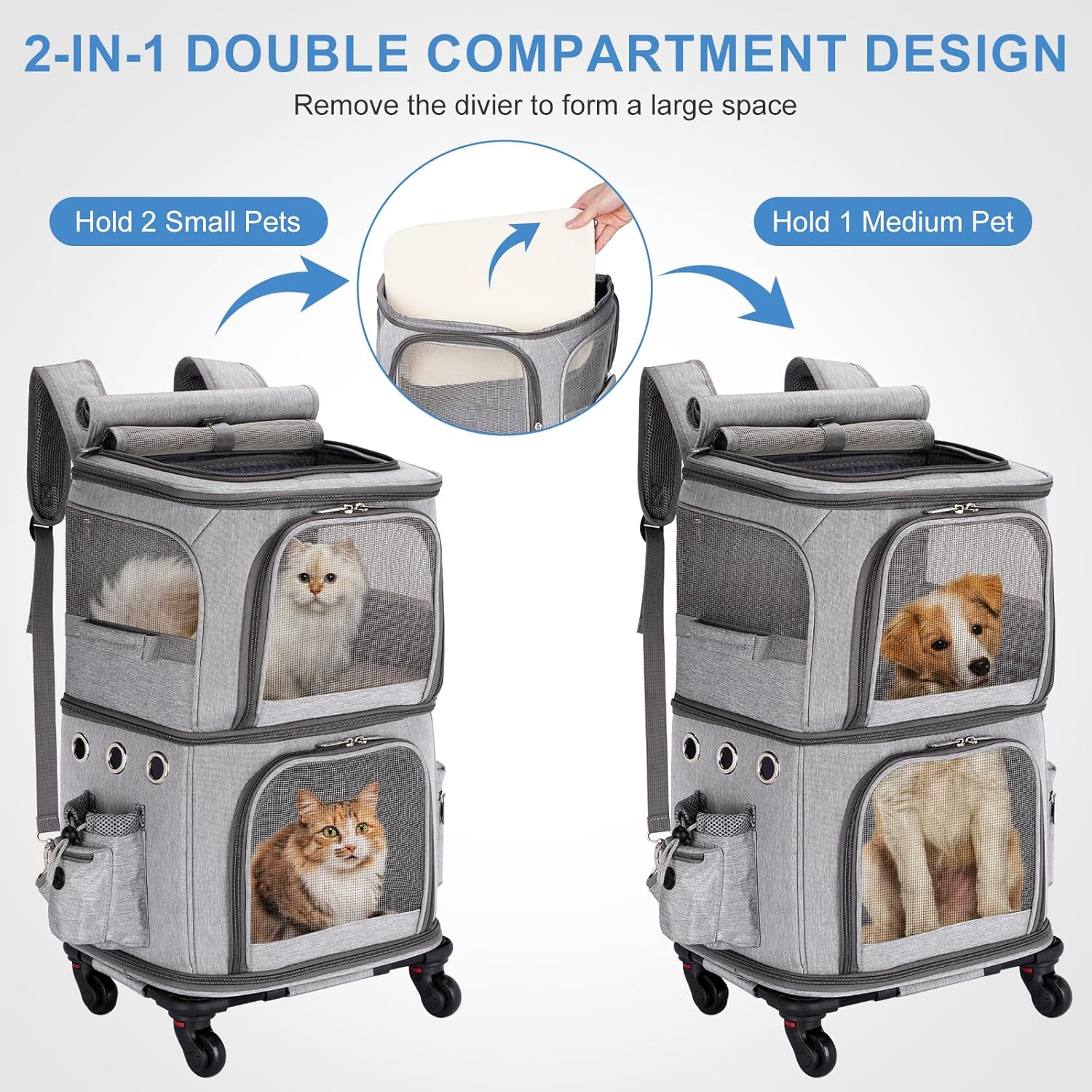 Раница за превоз на котки с 2 отделения, подвижни колела, сгъваема раница за превоз на кучета за 2 котки, малки кучета, сива, XL
