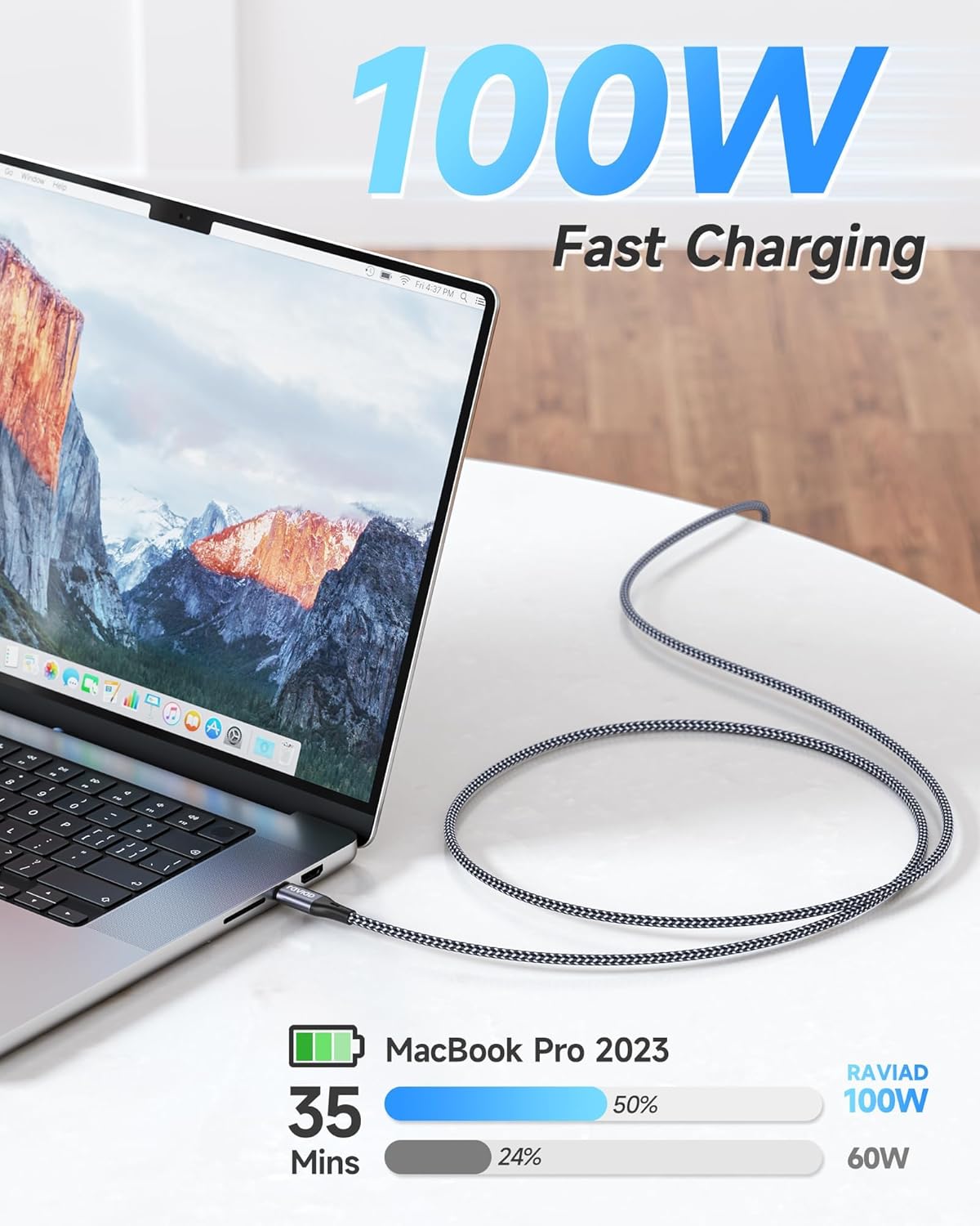 • 100W бързо зареждане и пренос на данни: Кабелът за бързо зареждане RAVIAD USB C към USB C поддържа PD 3.0 и QC 3.0. С нашия светкавично бърз 100W USB-C към USB-C кабел, вашият iPhone серия 15 постига невероятните 71% зареждане на батерията само за 30 минути. MacBook Pro 2023 може да се използва за 30 минути с този USB-C кабел за зареждане и съответното USB-C захранване. Зареден е до 42%, с 58% по-бързо отколкото с 60W USB-C кабел за зареждане. И поддържа скорост на пренос на данни от 480Mbps. (Забележка: Този USB-C кабел не поддържа видео изход.)