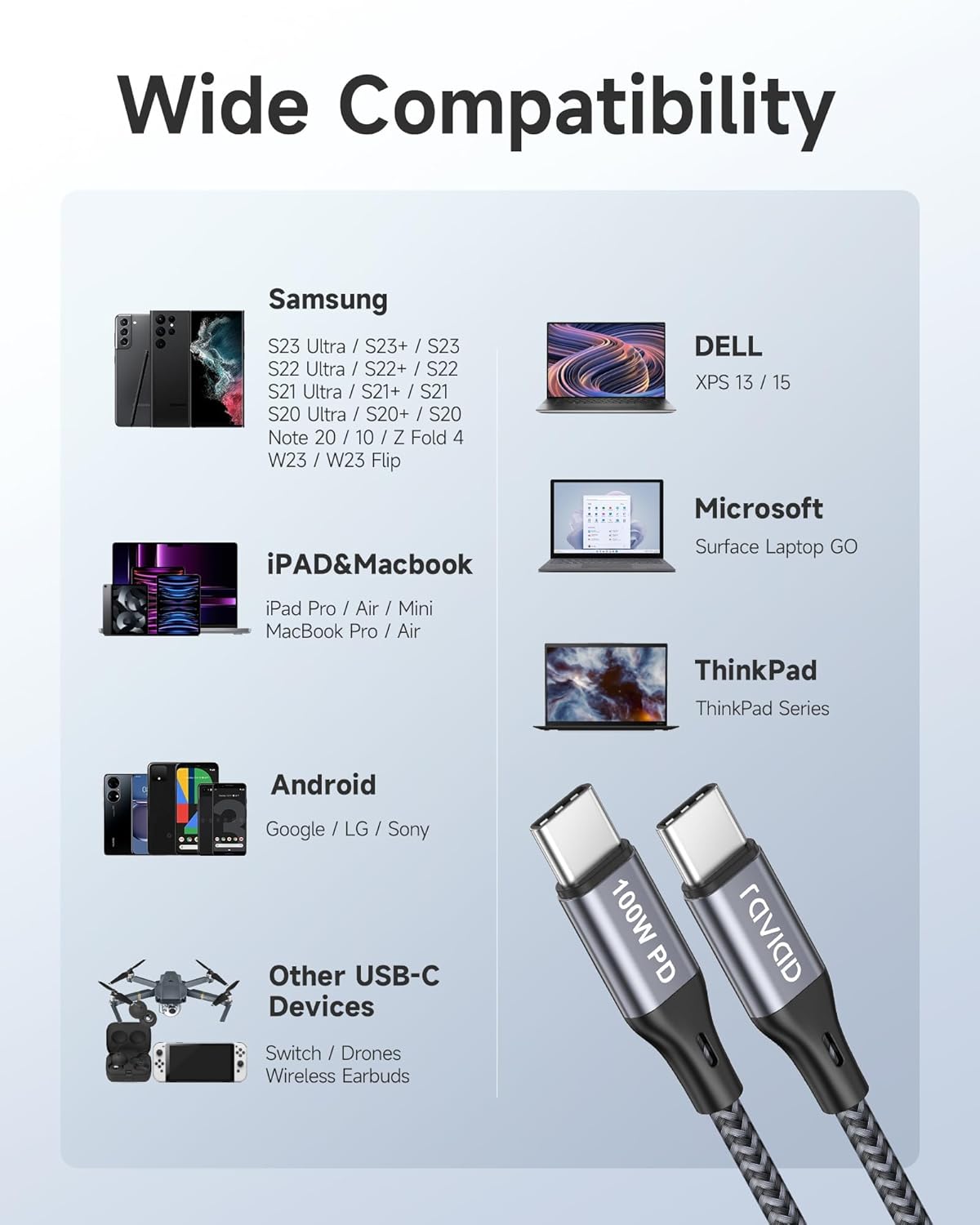 • Широка съвместимост: кабелът за бързо зареждане RAVIAD USB C е съвместим с MacBook, смартфон, таблет и лаптоп. Например: iPhone 16/16 Pro/16 Pro Max/iPhone 15/15 Pro/15 Pro Max, Samsung Galaxy S24/S23/S22/S21/S20/S10+/S10/S9+/S9/S8, Note 20/9/8/A90/A70/A51/A21s, Pad Pro 11"2 020/2018, Air 2020/2018, Pro 13'' 2019/2018/2017, MacBook, Pad, Air, Huawei P50/P40/P30/P20/P10, Mate 20/10, HTC, Google Pixel и други.