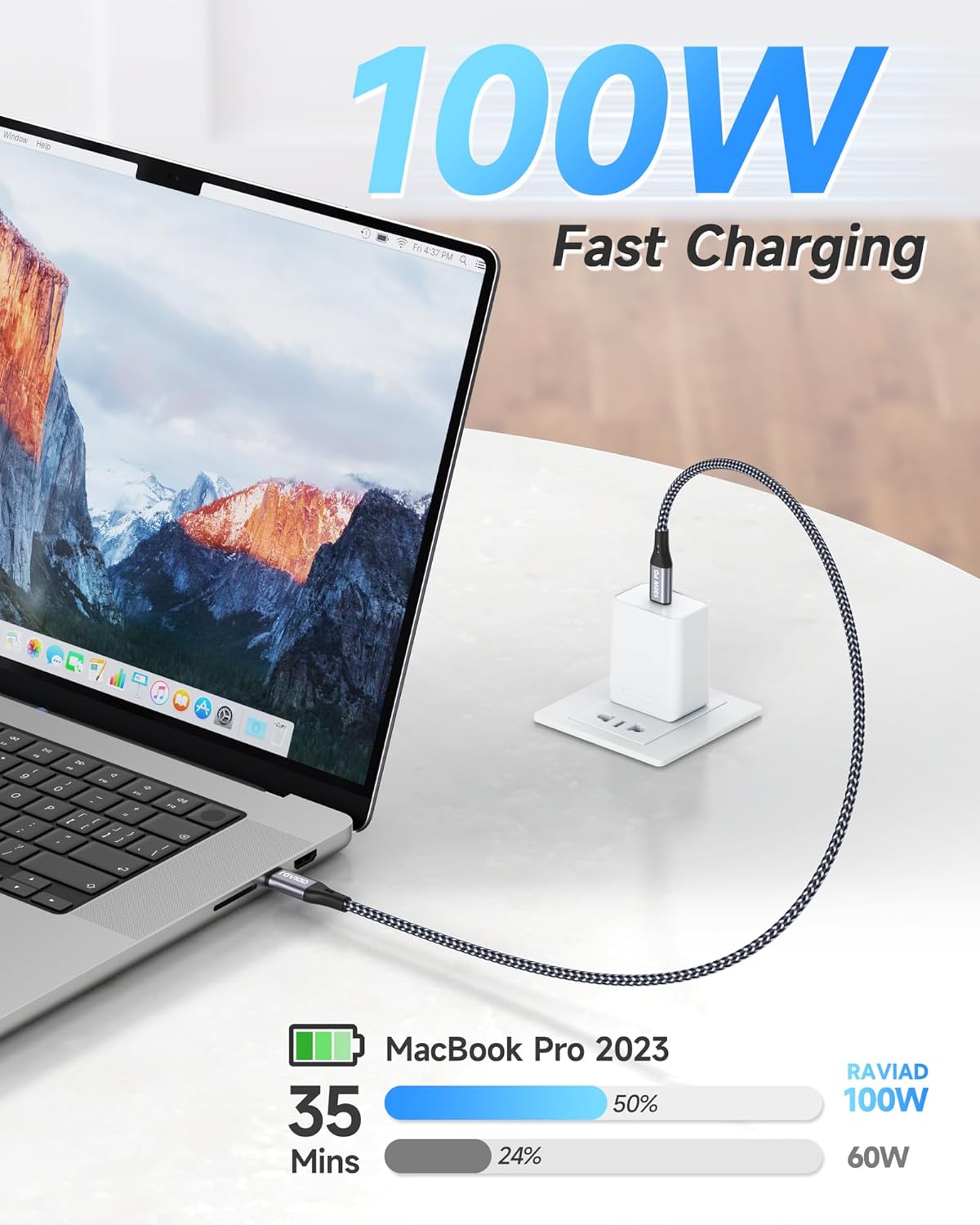 • 100W бързо зареждане и пренос на данни: Кабелът за бързо зареждане RAVIAD USB C към USB C поддържа PD 3.0 и QC 3.0. С нашия светкавично бърз 100W USB-C към USB-C кабел, вашият iPhone серия 15 постига невероятните 71% зареждане на батерията само за 30 минути. MacBook Pro 2023 може да се използва за 30 минути с този USB-C кабел за зареждане и съответното USB-C захранване. Зареден е до 42%, с 58% по-бързо отколкото с 60W USB-C кабел за зареждане. И поддържа скорост на пренос на данни от 480Mbps. (Забележка: Този USB-C кабел не поддържа видео изход.)