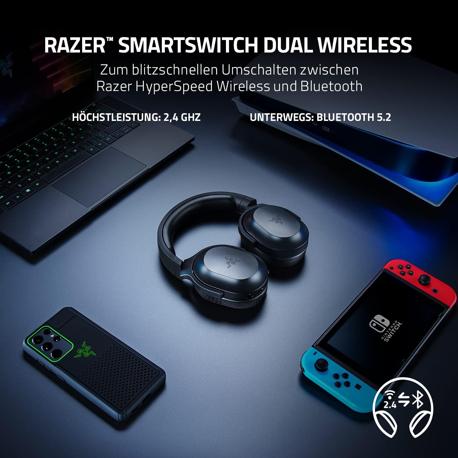 • Razer SmartSwitch Dual Wireless за светкавично бързо превключване между Razer HyperSpeed ​​​​Wireless и Bluetooth: Слушалките могат удобно да превключват мигновено между бързи 2.4 GHz и Bluetooth, което ви позволява безпроблемно да превключвате между компютър/конзола и телефон.