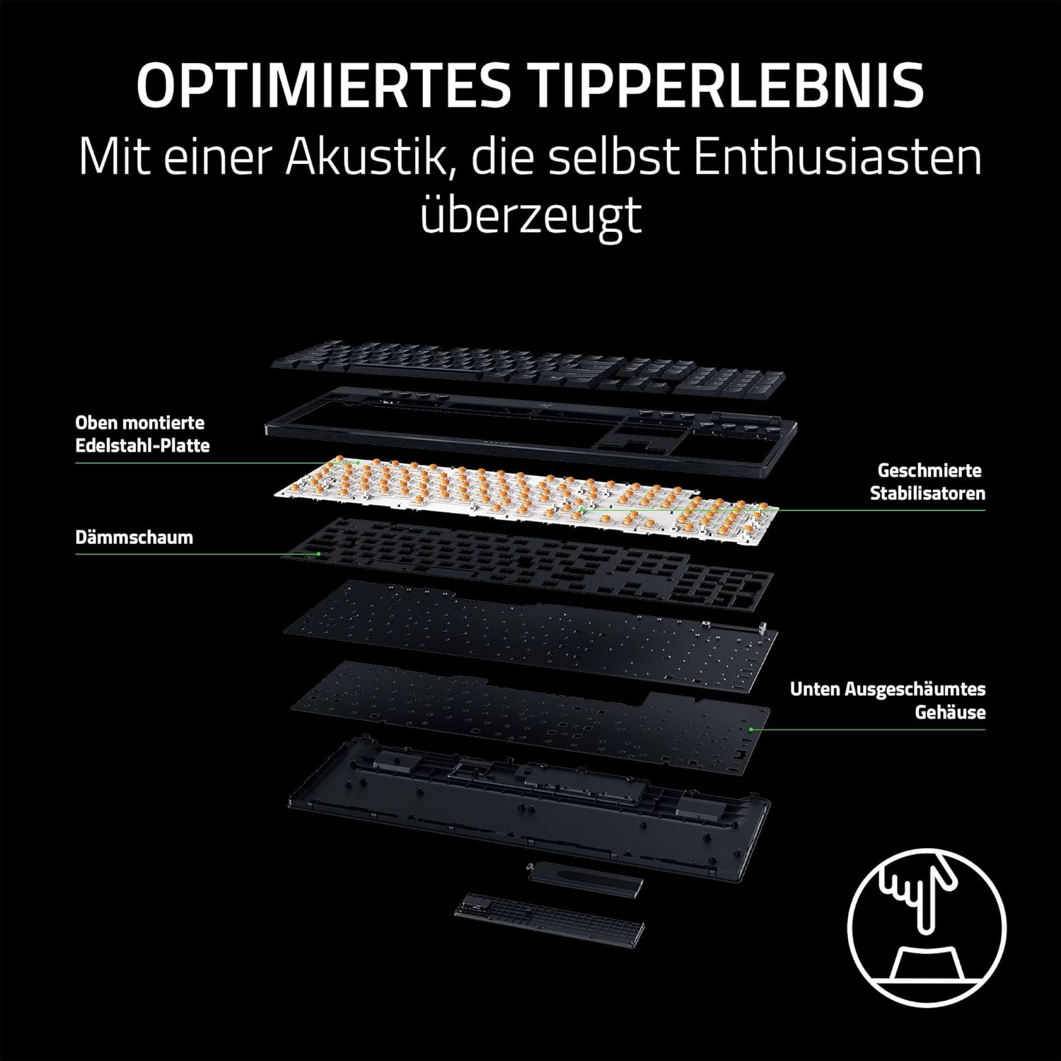 • Механични превключватели Razer Green За прецизно задействане с щракащо, тактилно докосване: С точка на задействане от 1,9 мм и сила на задействане от само 50 г, получавате перфектната комбинация от натиск и време за реакция – за прецизни входове с отличителна, тактилна обратна връзка.