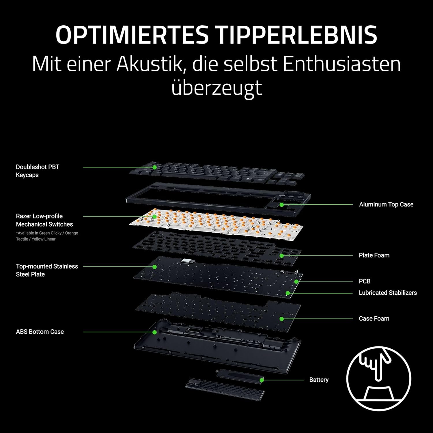 • Механични превключватели Razer Green За прецизно задействане с щракащо, тактилно докосване: С точка на задействане от 1,9 мм и сила на задействане от само 50 г, получавате перфектната комбинация от натиск и време за реакция – за прецизни входове с отличителна, тактилна обратна връзка.