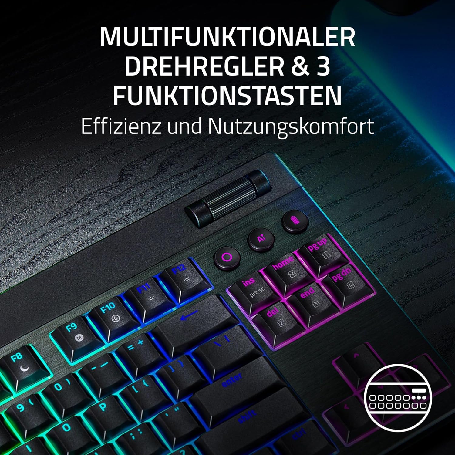 • Двустранно осветление на долната част и осветление на всеки клавиш, задвижвано от Razer Chroma RGB: Осветлението на всеки клавиш и хипнотизиращото осветление на долната част осветяват клавиатурата от още повече ъгли, перфектно синхронизирани с вашата Battle Station за още по-голямо потапяне в стотици поддържани игри.