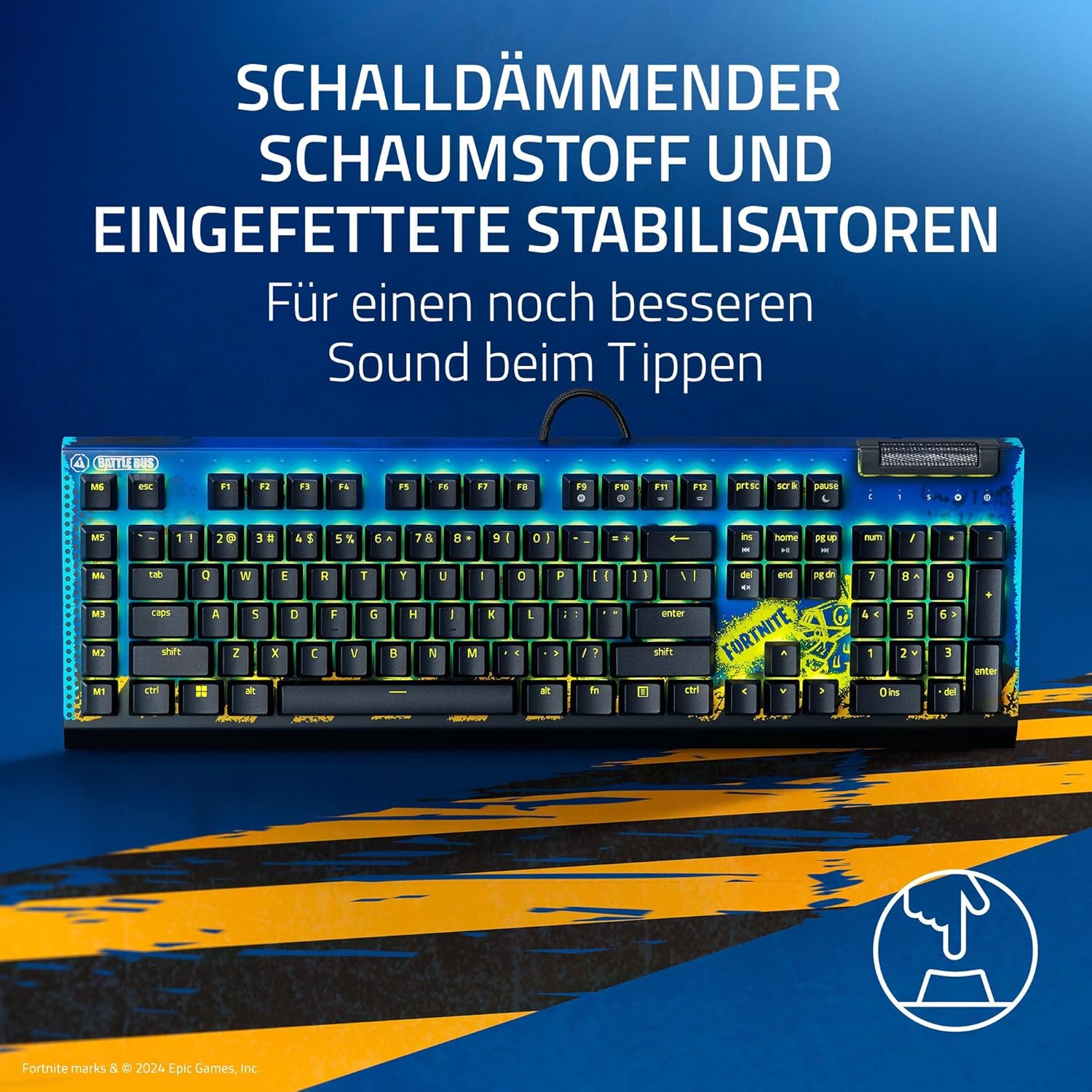 Razer BlackWidow V4 X - Fortnite Edition Механична геймърска клавиатура с RGB (жълти превключватели, 6 персонализирани макро клавиша, двойни ABS капачки) QWERTY US подсветка | Fortnite