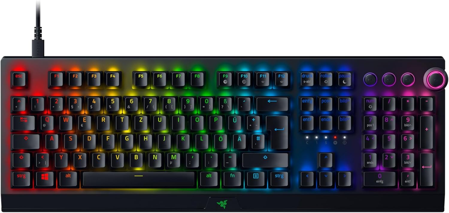 Razer BlackWidow V4 (зелен превключвател) - Механична геймърска клавиатура - Razer Snap Tap (механични щракащи превключватели, 6 макро клавиша, двойни ABS капачки за клавиши, RGB Chroma) QWERTZ DE разположение | Черна