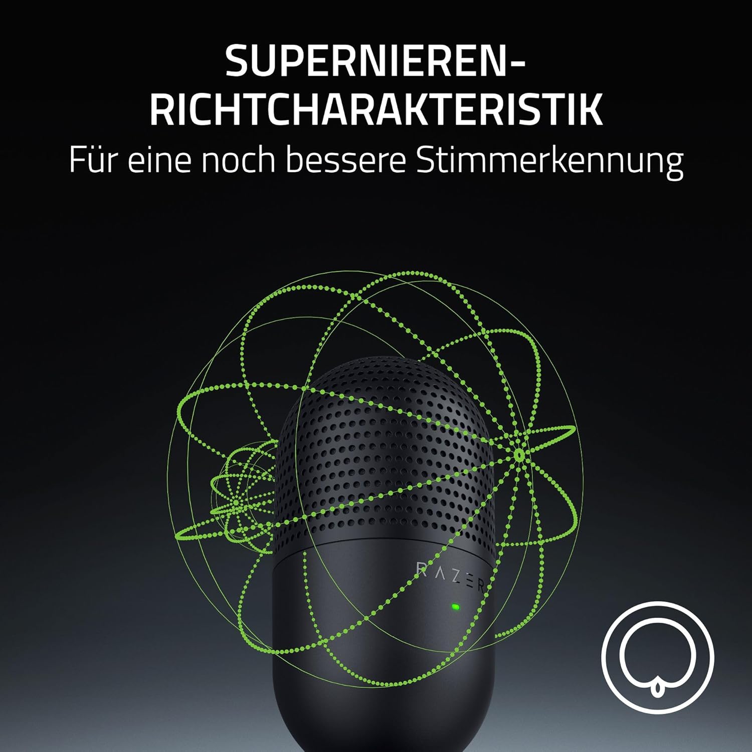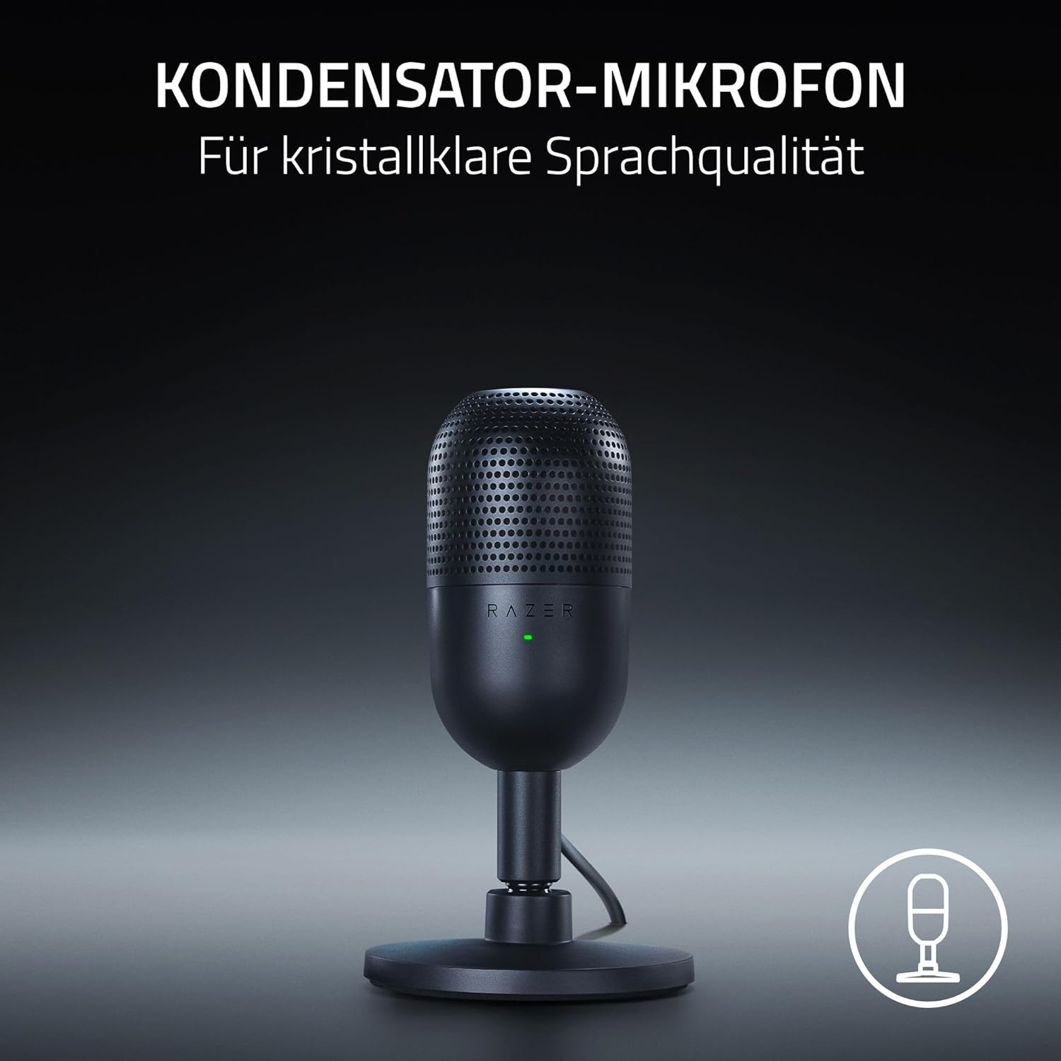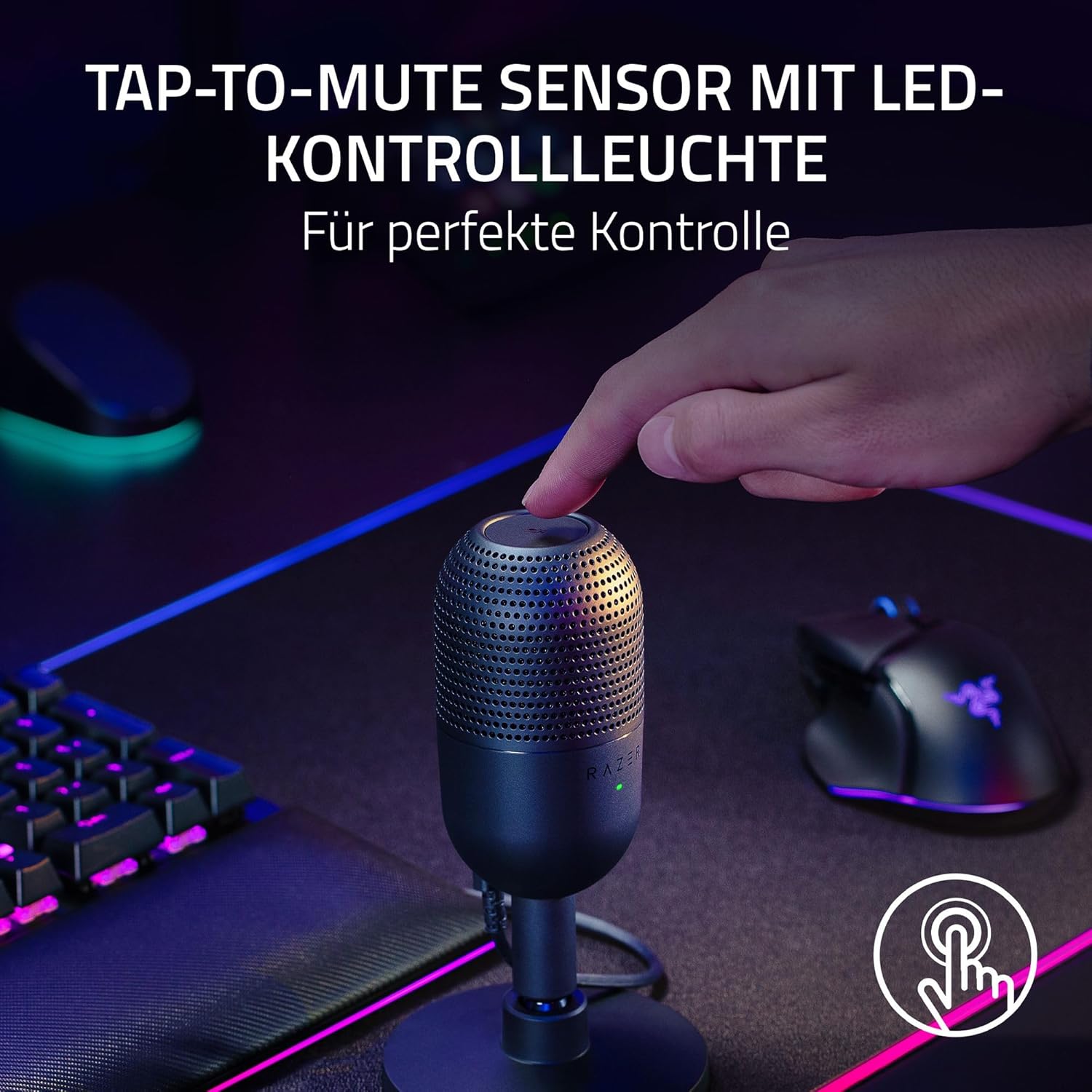 Razer Seiren V3 Mini - Ултракомпактен USB микрофон (14 мм суперкардиоиден кондензаторен микрофон, сензор за изключване на звука с докосване с LED индикатор, вградена противоударна стойка, plug-and-play дизайн) Черен