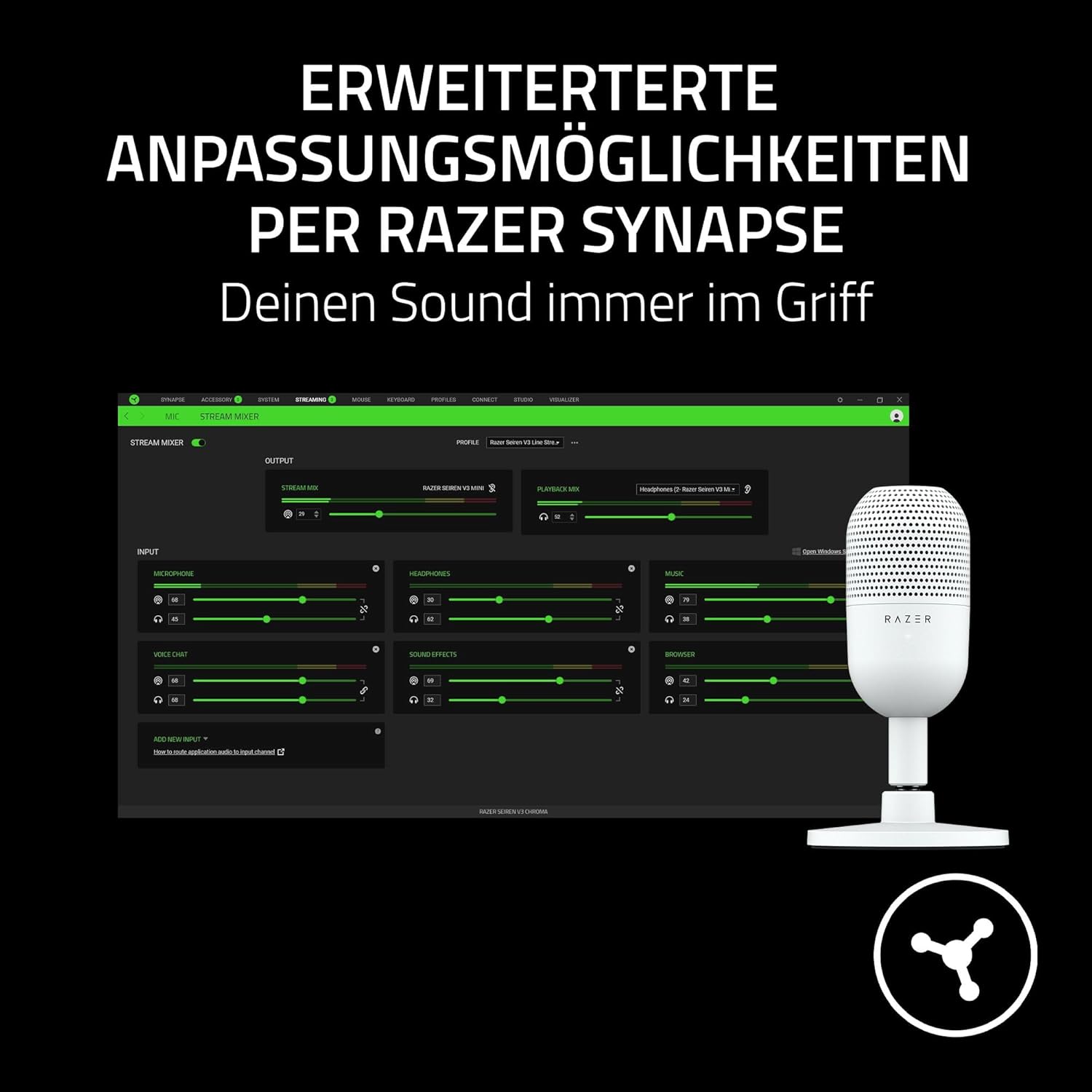 • Разширени опции за персонализиране с Razer Synapse - Контролирайте звука си по всяко време: Създайте перфектната си конфигурация, използвайки една мощна платформа - можете да персонализирате осветлението на микрофона, да задавате семплиране и битрейт, подобни на студийни, да дефинирате отделни нива на силата на звука за възпроизвеждане и вашия стрийминг микс и много други.