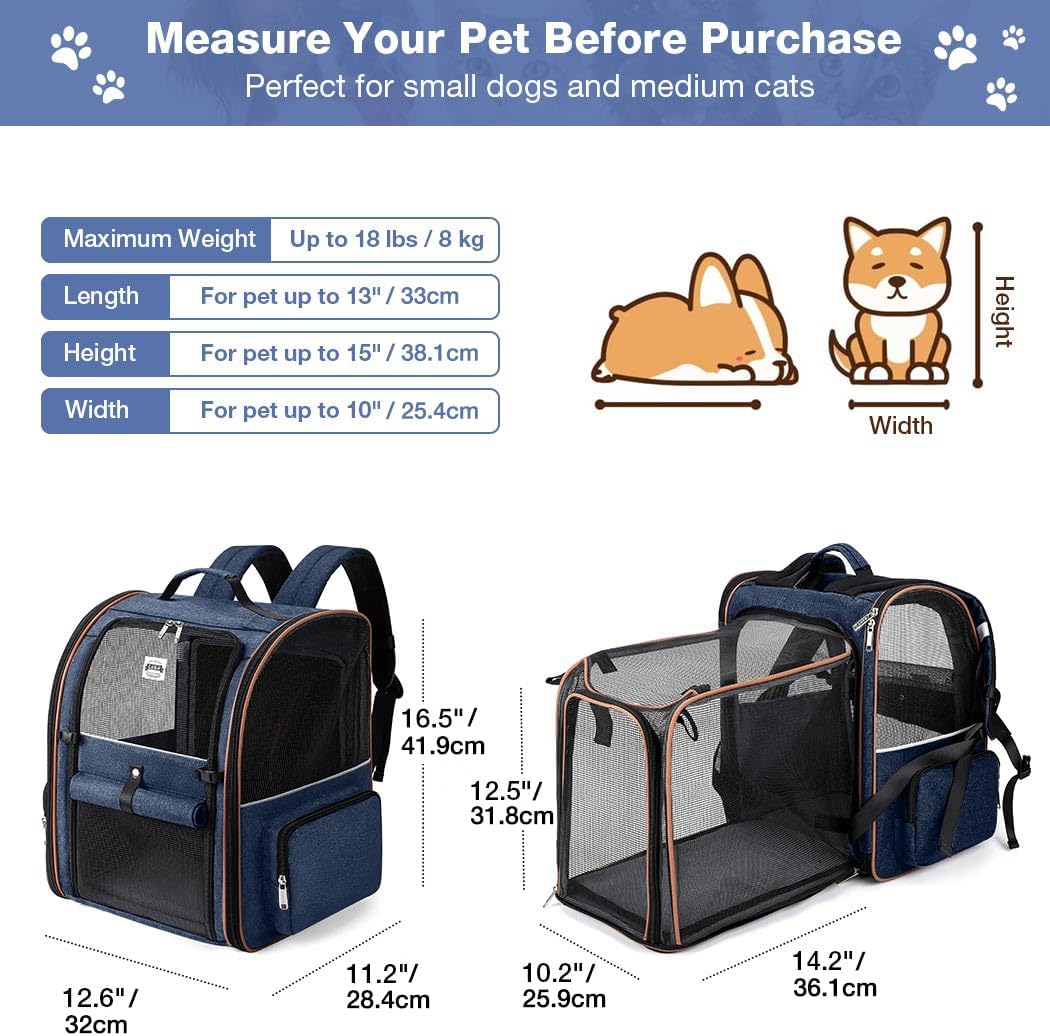 Раницата за котки е с размери приблизително 32 x 28,4 x 42 (Диаметър и Височина). Максималната товароносимост е 8 кг. Побира 1 котка / 2 котенца или зайци до 8 кг; подходяща за малки или средни кучета до 6 кг.