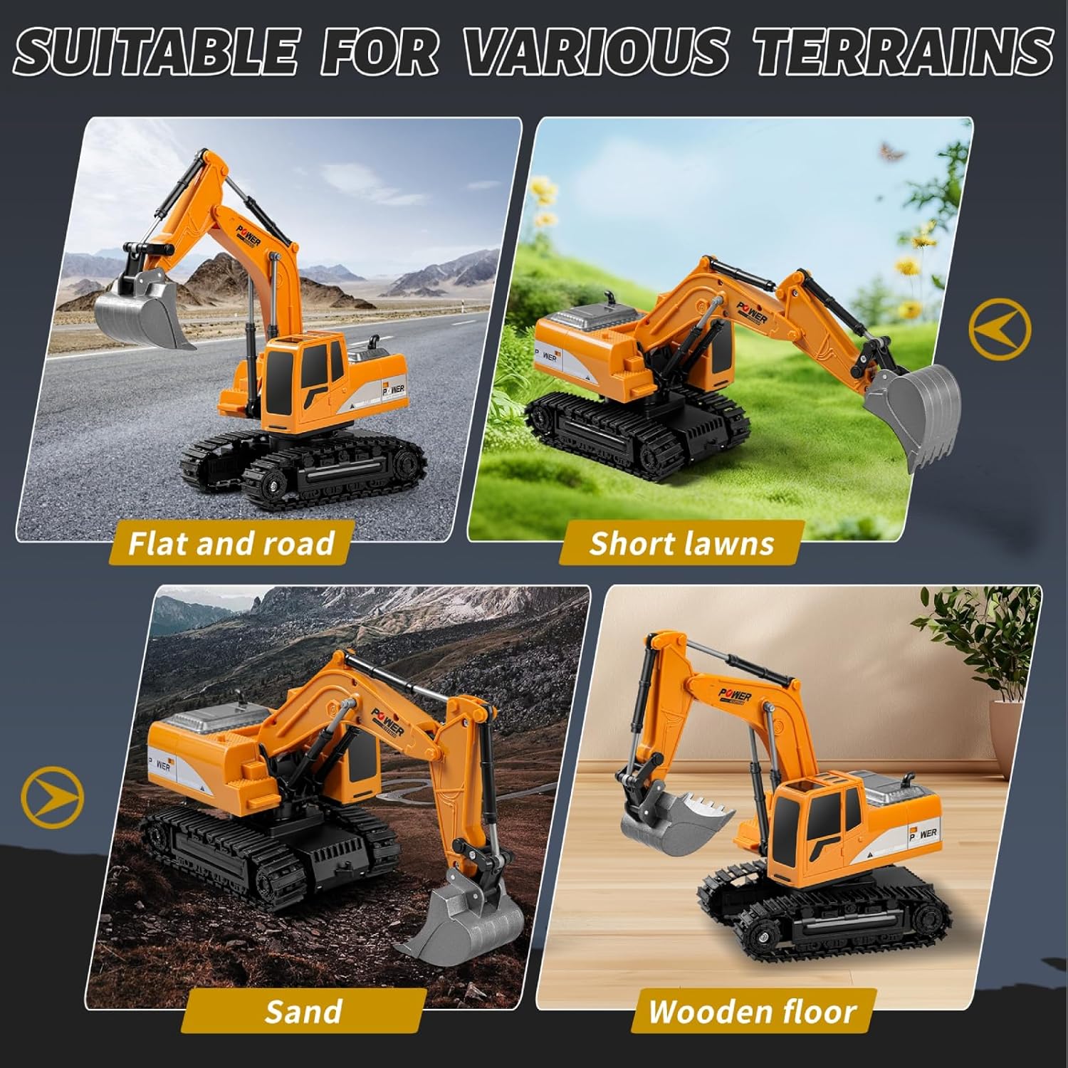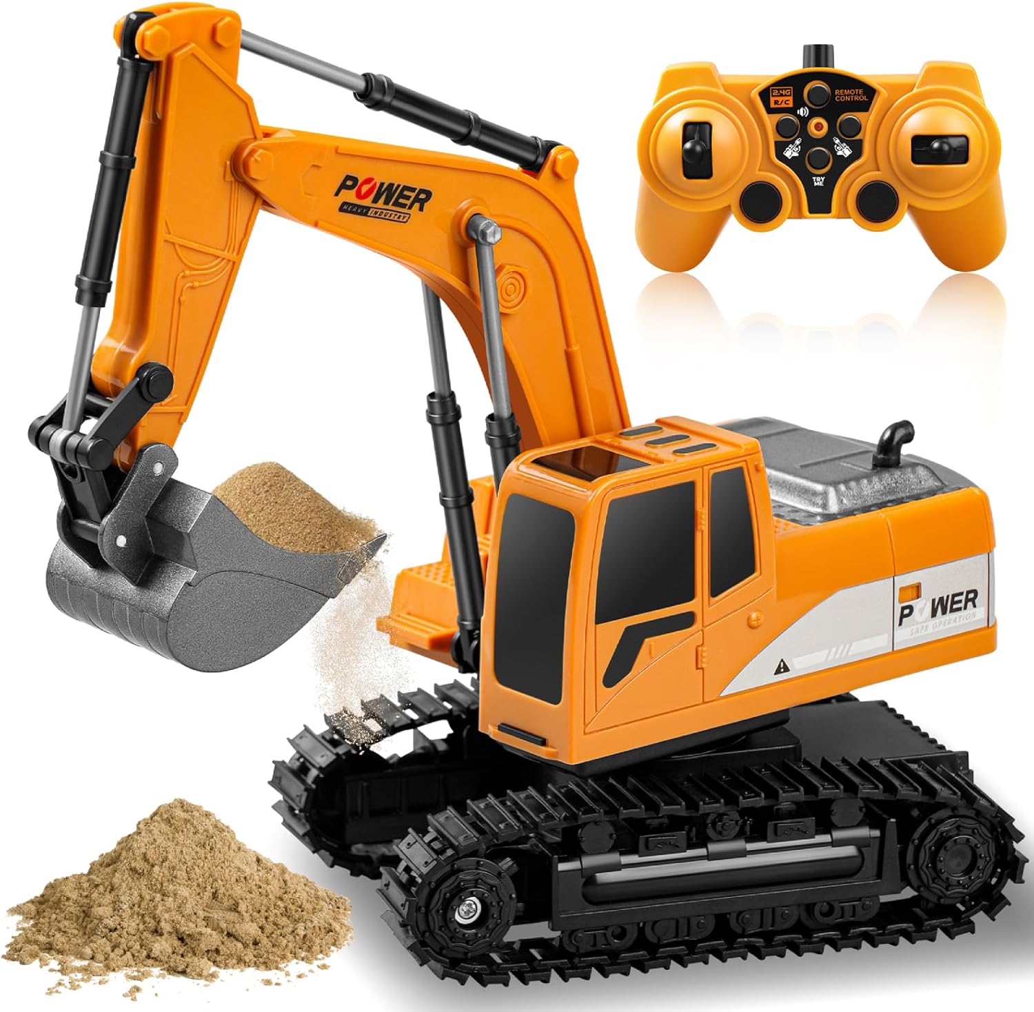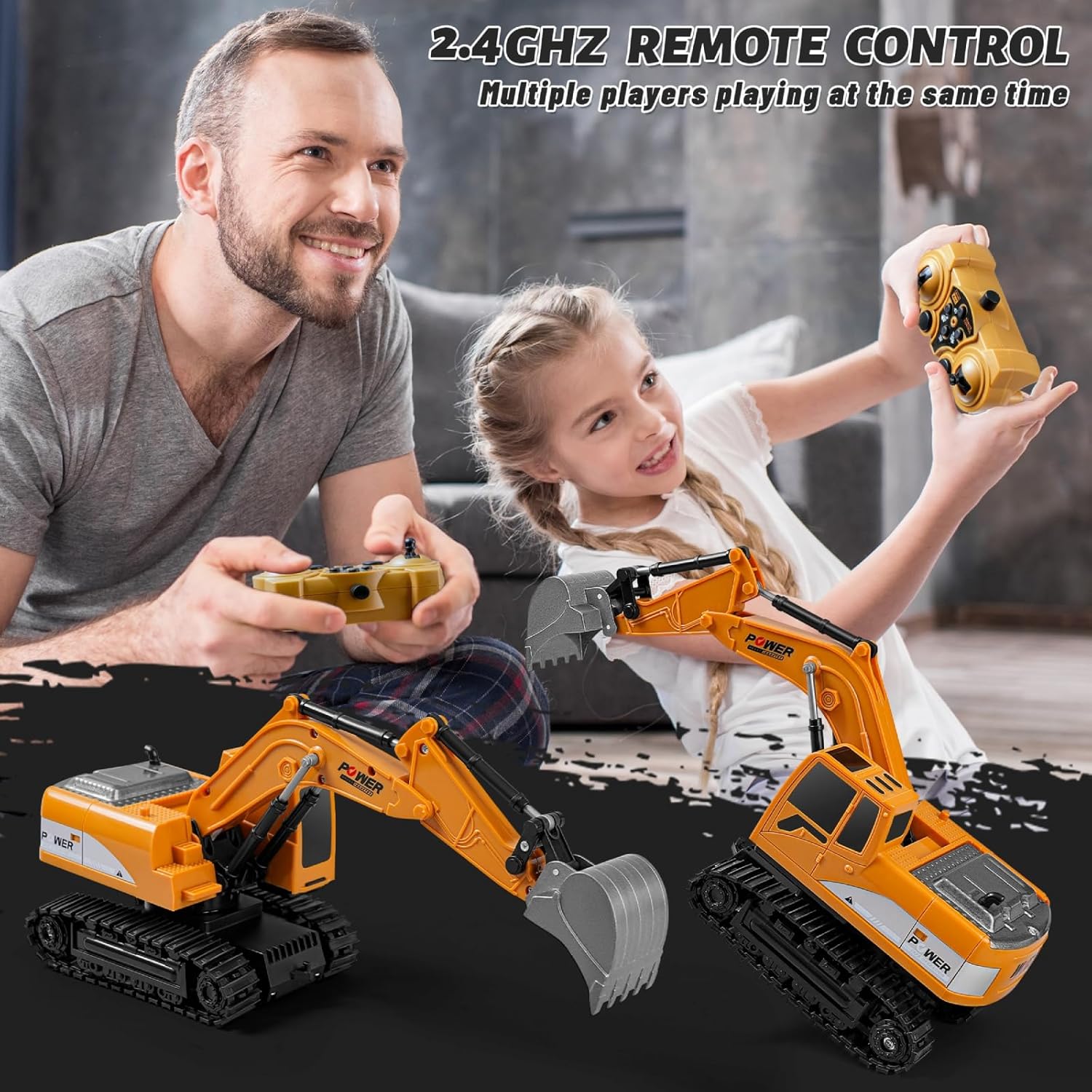 RC багер за деца 3-5 години - играчка багер, дистанционно управляема хидравлична играчка багер за момчета 4-7, строителен камион с 60+ минути време за игра/звук/светлина