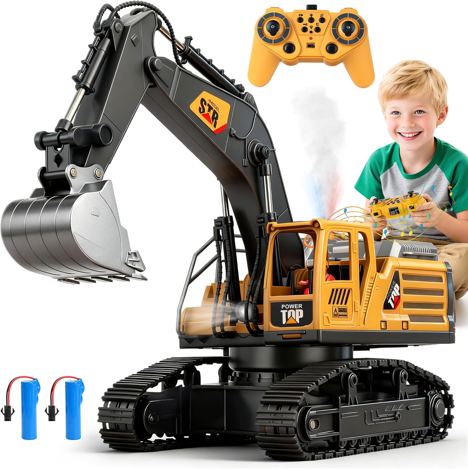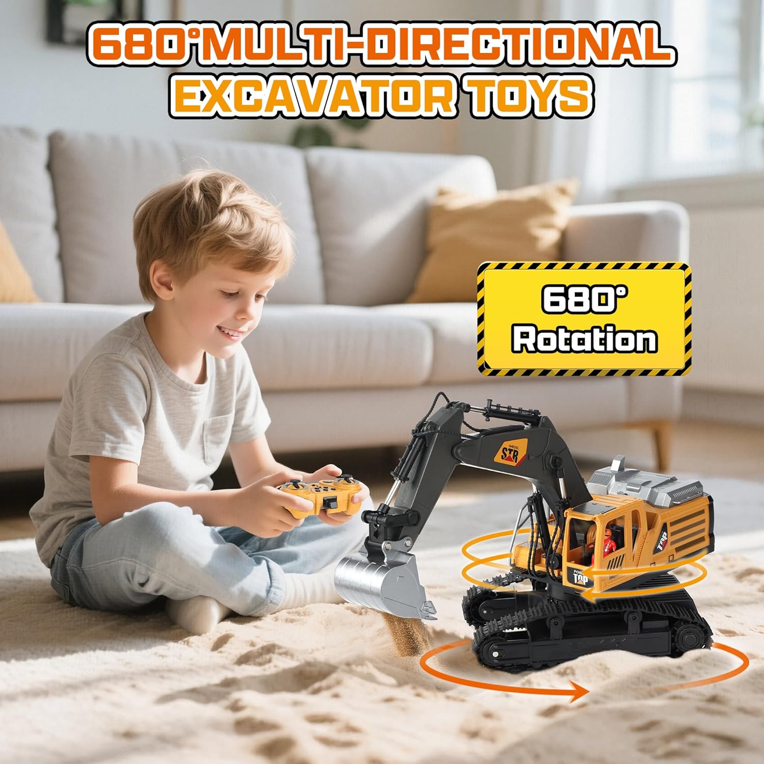 RC играчка багер с дистанционно управление за момчета от 3, 4, 5, 6, 7, 8, 9 години – играчка колички багер, метална лопата със спрей, светлина, звук, въртене на 680°, кола с дистанционно управление за момчета, подарък за деца