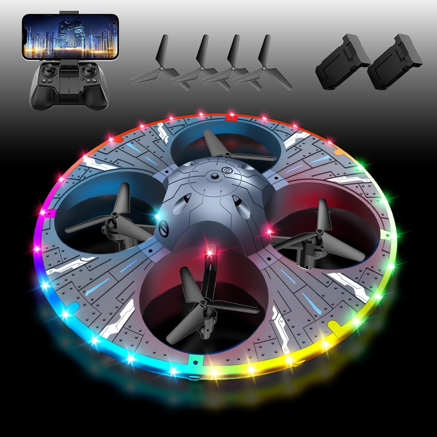 RC НЛО дрон за деца и начинаещи, мини дрон с камера и цветни LED светлини, детски квадрокоптер с функция за завъртане на 360° и избягване на препятствия, с две батерии