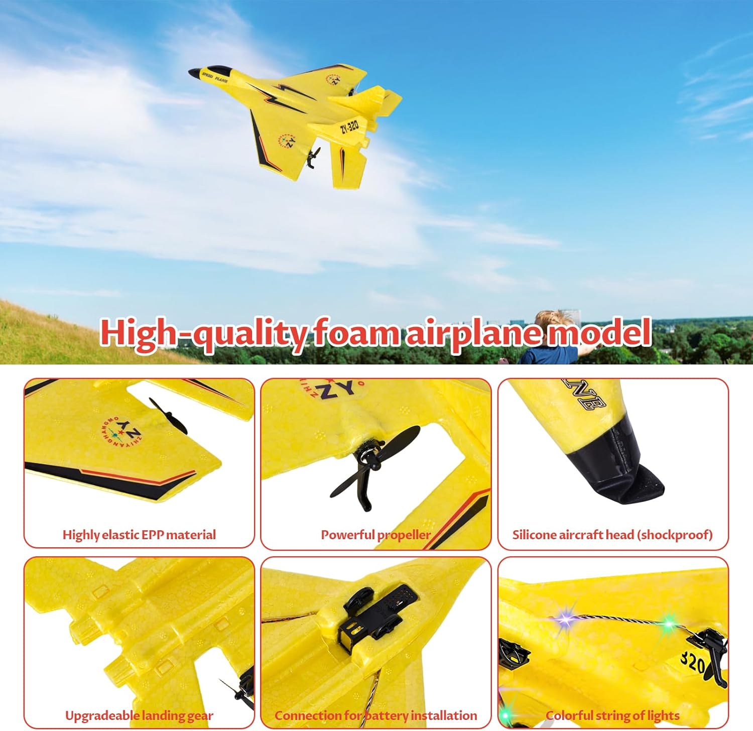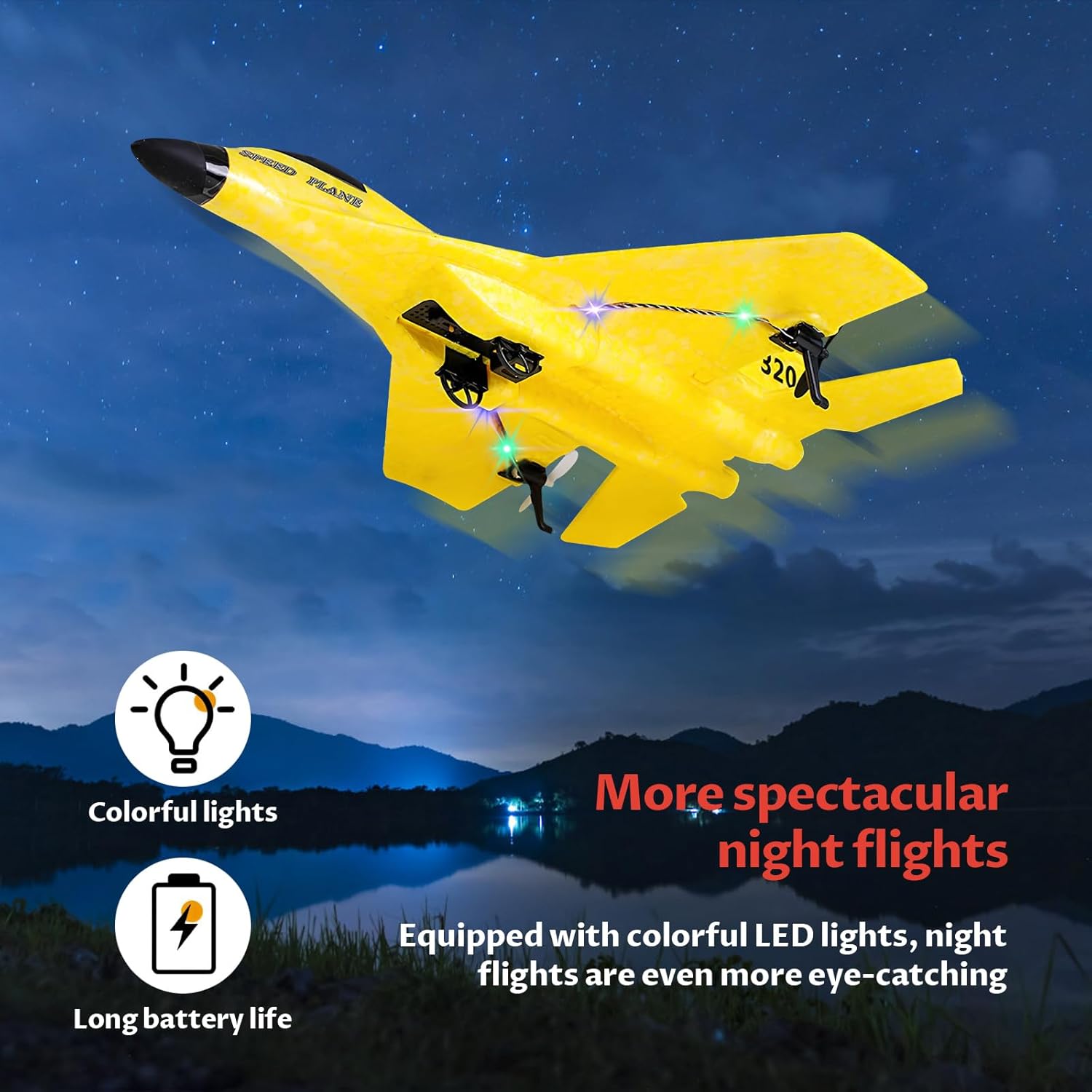 Този дистанционно управляван самолет има два режима на стартиране, старт от земята и ръчно хвърляне, а също така е оборудван с LED нощни светлини, които правят нощния полет по-красив. Силиконов дизайн на главата против сблъсък, перфектна защита на самолета.