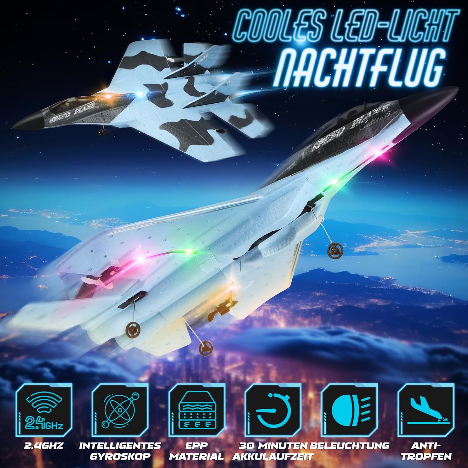 • ГОТИНА С LED СВЕТЛИНИ Нашият RC Jet е проектиран в камуфлажен модел, за да изглежда като истински F-22. Той също така има LED светлини, което прави летенето през нощта с фаровете още по-готино.