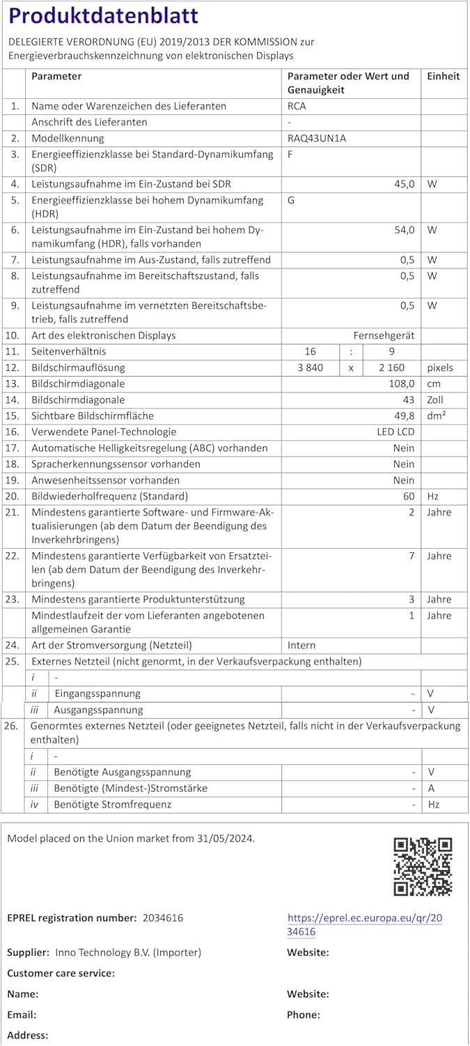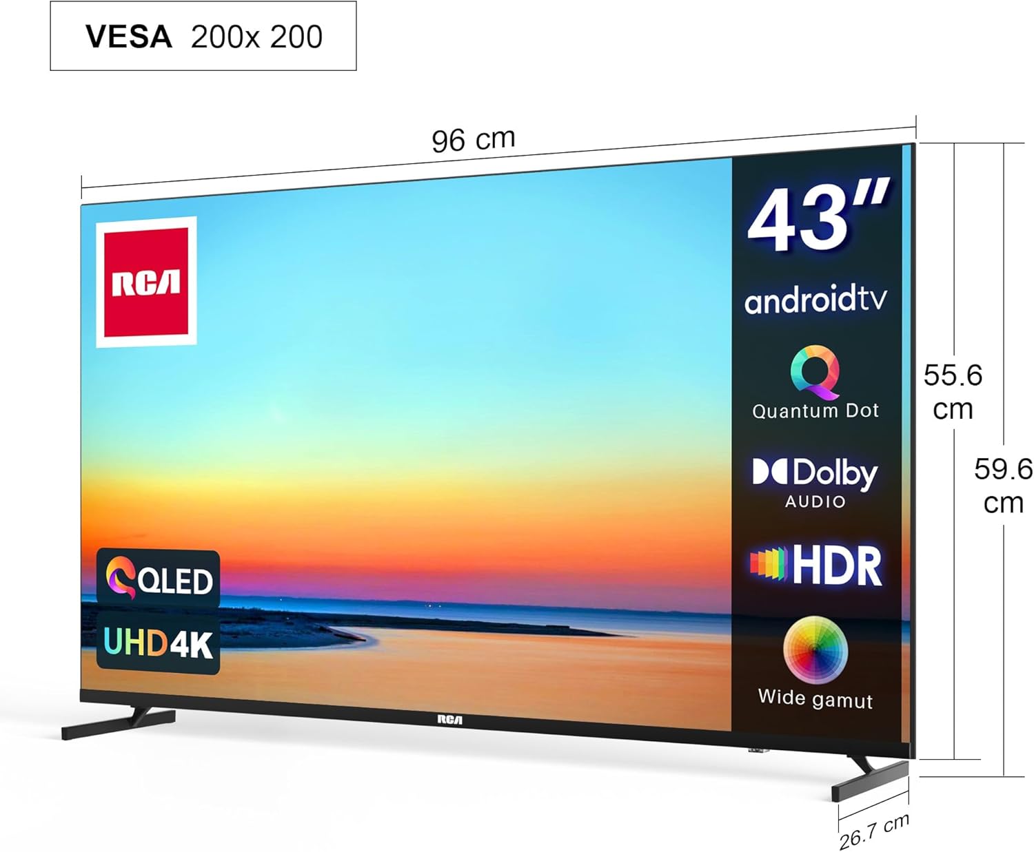 RCA QLED телевизор 43 инча (108 см), UHD Smart TV, WiFi, Bluetooth, 4K HDR, App Store, троен тунер (DVB-C/S/S2/T/T2)