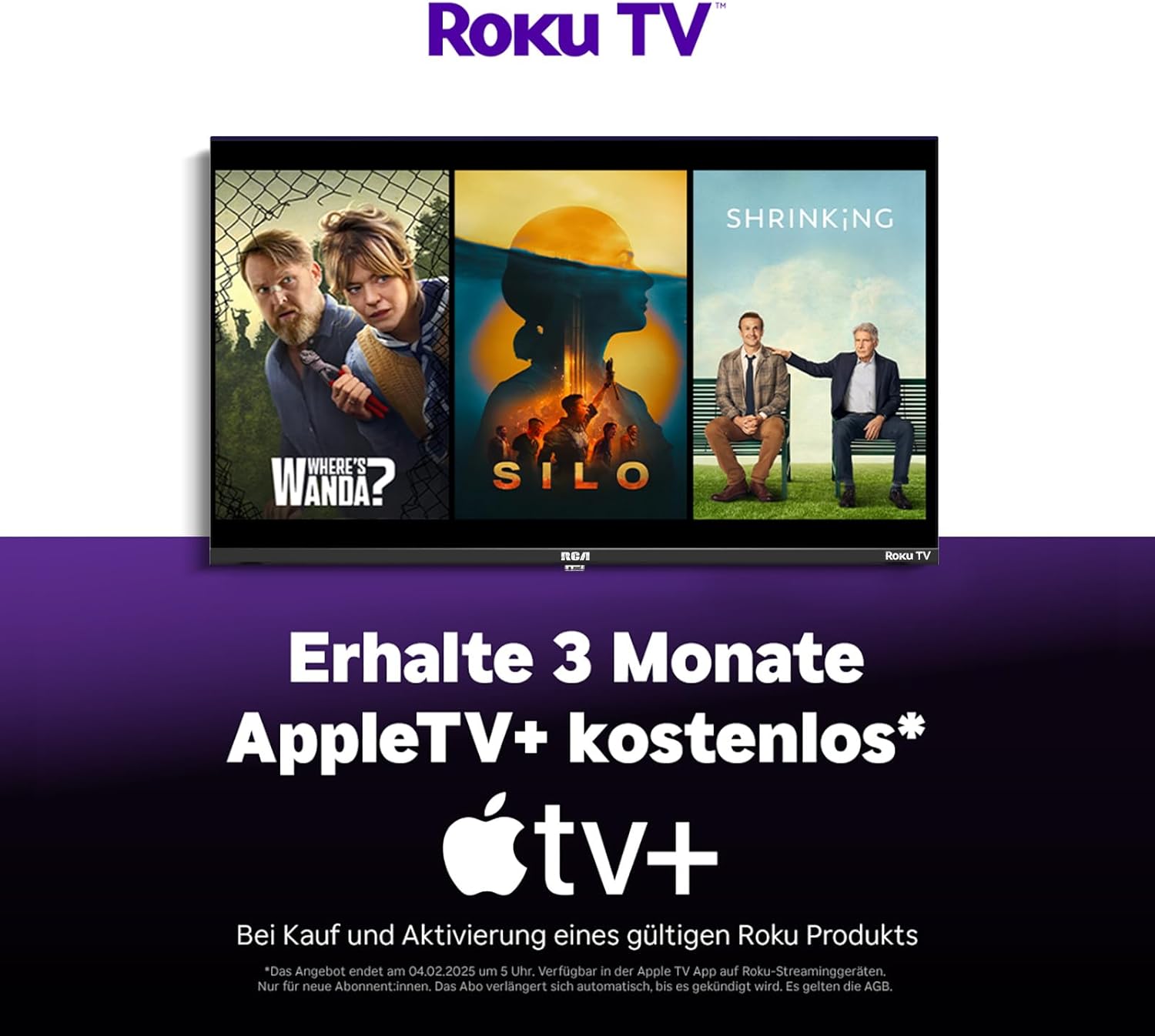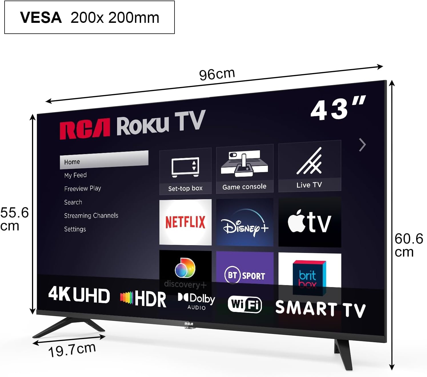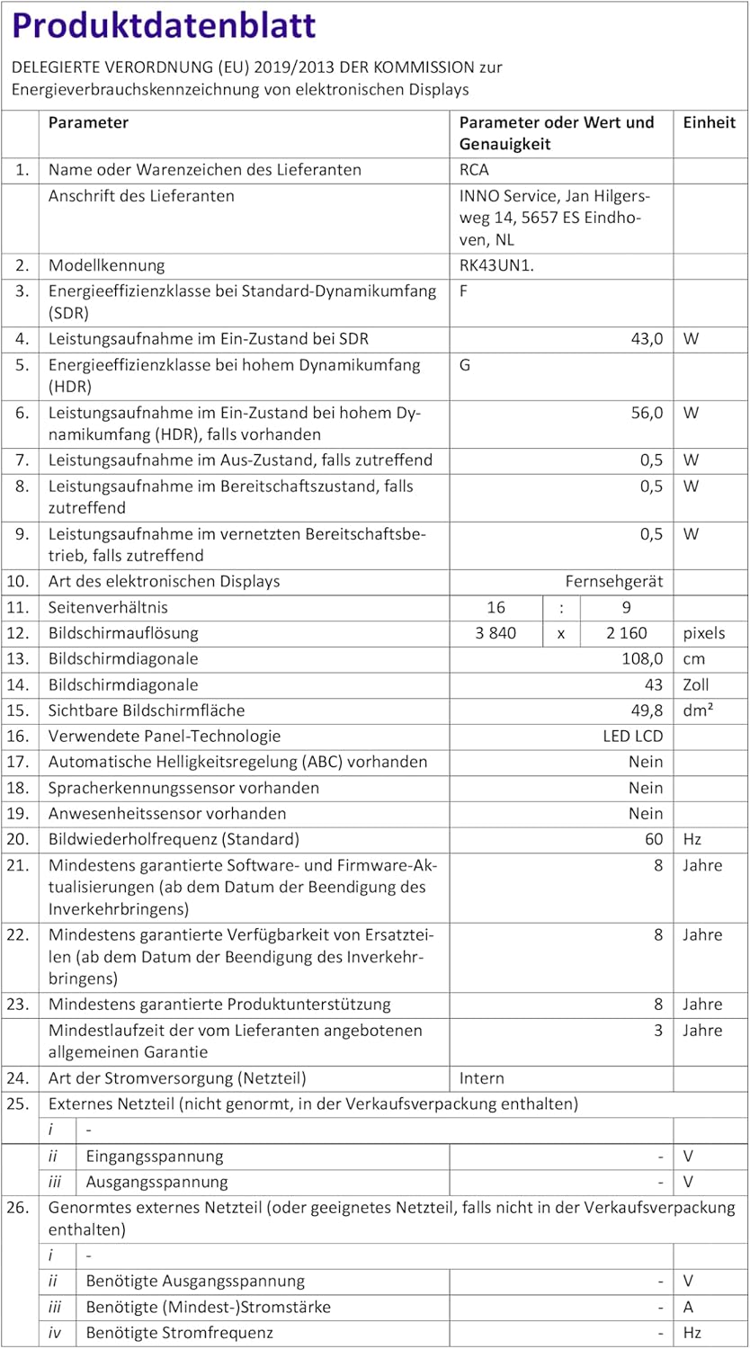 RCA телевизор 43 инча (108 см), UHD 4K Smart TV с WiFi, троен тунер (DVB-C/S/S2/T/T2), HDR10 HLG, RK43UN1, 2024 (само за Германия)