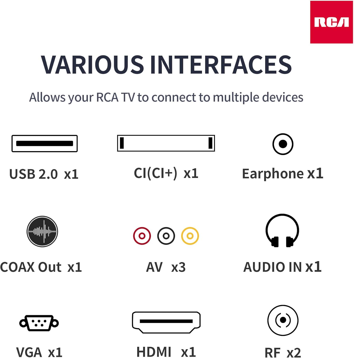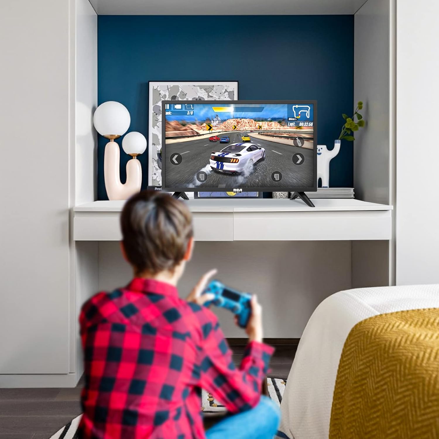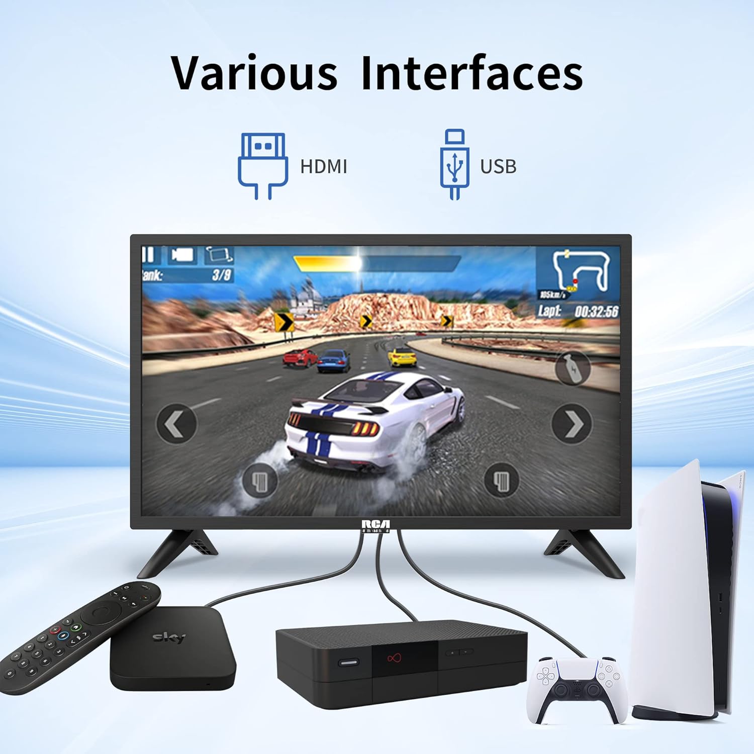 RCA TV 24" LED HD Малък телевизор за спалня/кухня с троен тунер (DVB-T/T2-CS/S2), HDMI, VGA, мултимедиен плейър, USB, CI+, хотелски модел, 220V