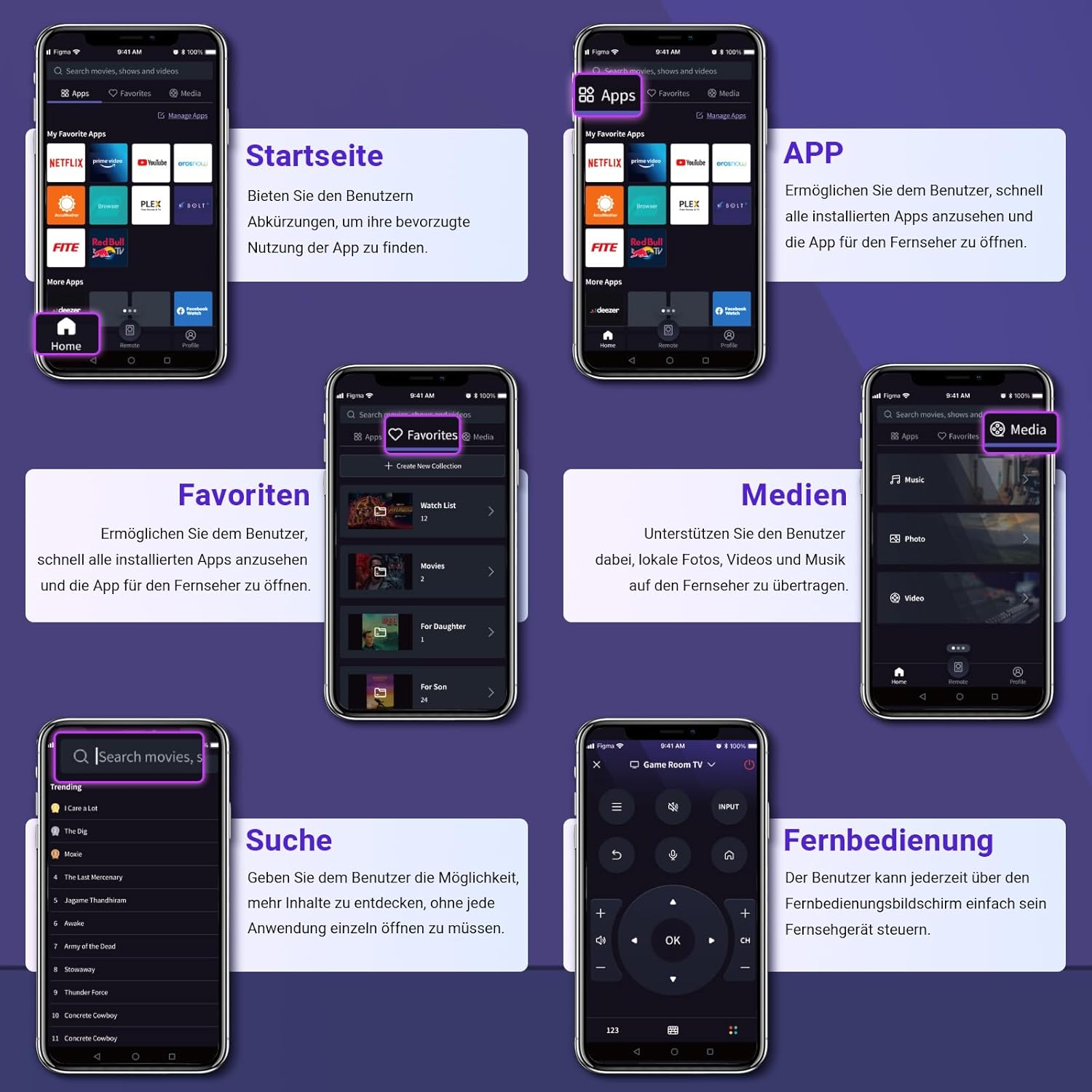 • Управление чрез приложение: С Wi-Fi можете лесно да управлявате този смарт телевизор от мобилни устройства, като например смартфони. Можете да използвате функцията за дистанционно управление, да гледате и търсите видеоклипове и да споделяте екрана си.