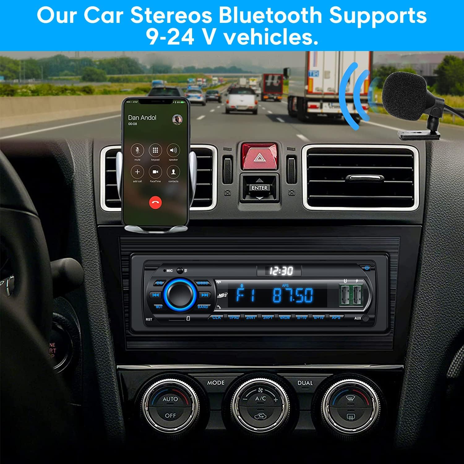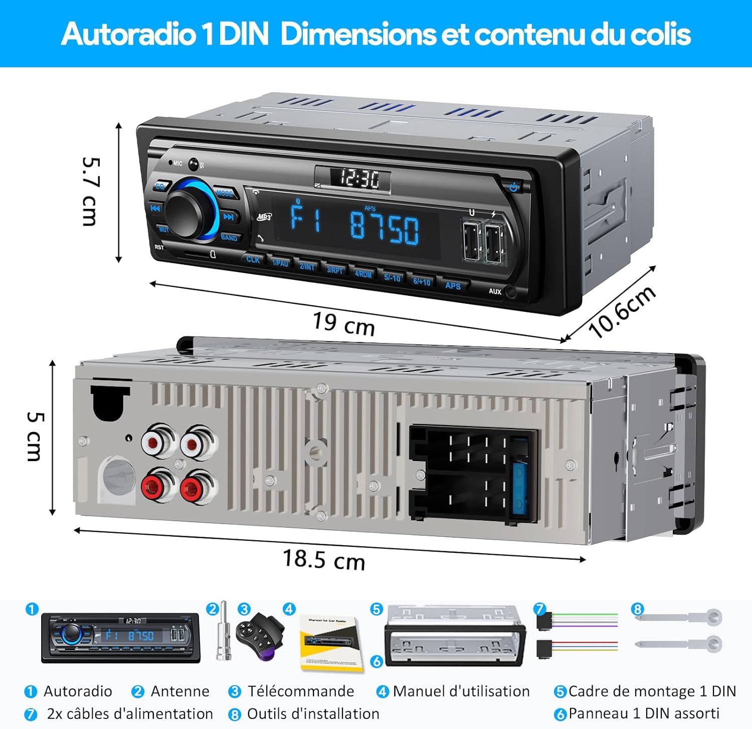 • 1 DIN автомобилно радио за автомобили 9V-24V: поддържа автомобили 9V-24V, пасва на почти всеки автомобил. Пакетът съдържа 1 x автомобилно радио, 1 x антена, 1 x съответстващ 1 DIN панел, 1 x дистанционно управление, 1 x ръководство за потребителя (английският език не е гарантиран), 1 x DIN монтажна рамка, 2 x захранващи кабела, 2 x монтажни инструмента.