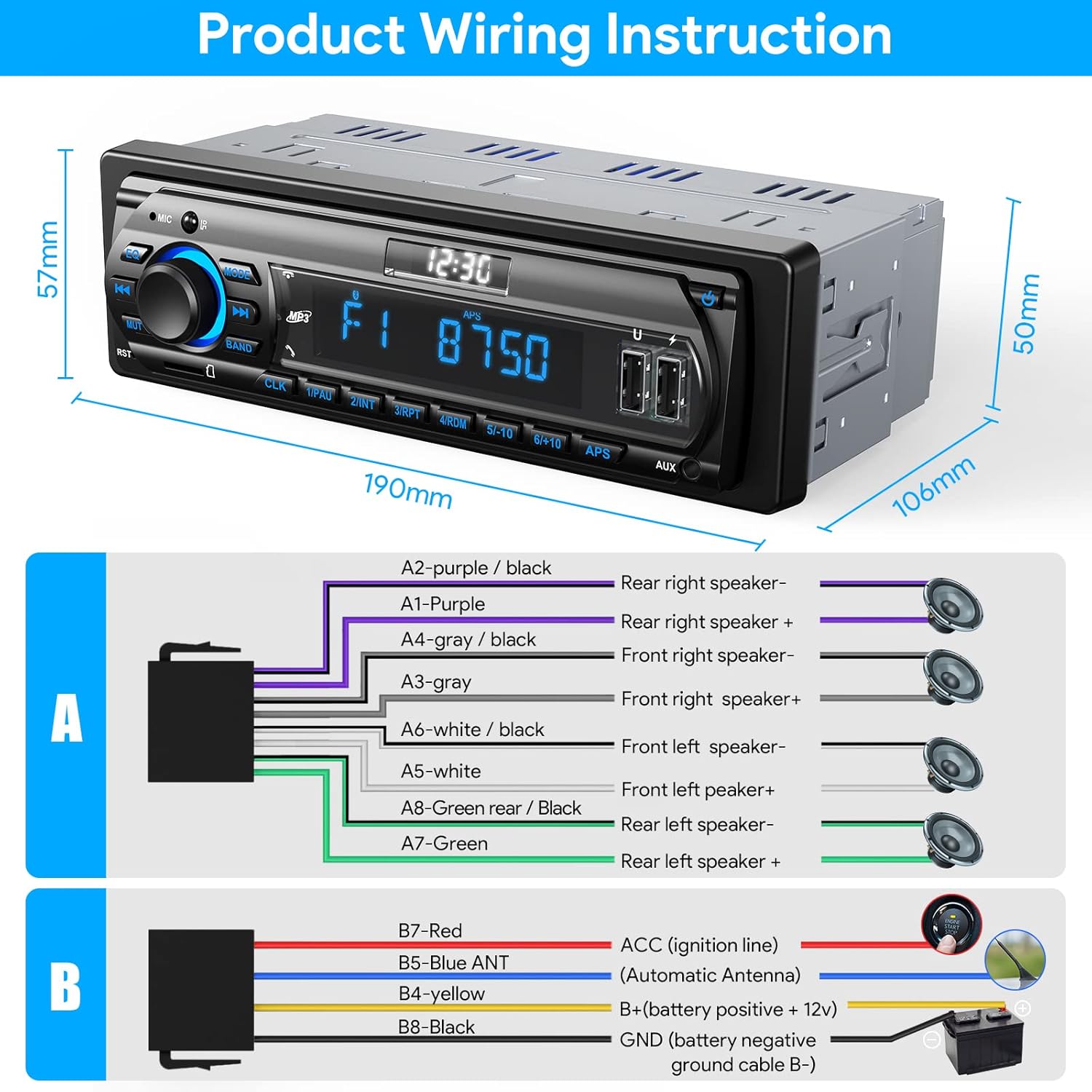 • Два USB порта и еквалайзер за звуков ефект: автомобилното радио с Bluetooth има два USB порта за зареждане (бързо зареждане 2.1 A) и музикални игри. Това автомобилно радио с USB поддръжка възпроизвежда музика чрез BT, SD, AUX, USB порт (USB поддържа MP3/WMA/WAV формати). Натиснете бутона EQ, за да изберете режим POP, CLAS, JAZZ, ROCK, FLAT. Четириканален вход, стерео съраунд звук.