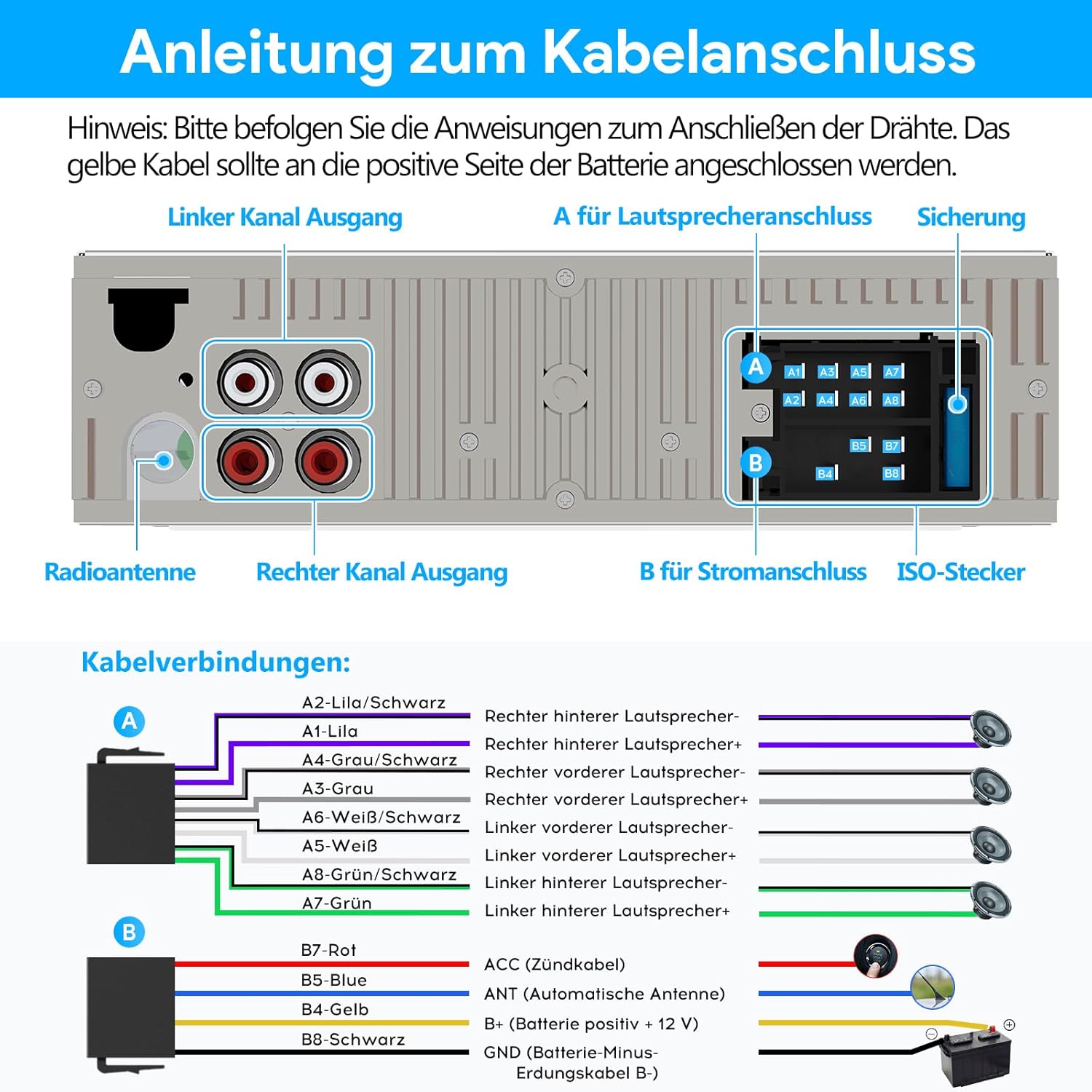 • Отстраняване на неизправности: Ако положителният и отрицателният извод на батерията са обърнати, продуктът не може да се включи. Когато жълтият и червеният кабел са разменени, радиото не може да запамети никакви станции. Автомобилното радио е подходящо за 1 DIN автомобили. Моля, не го използвайте за 2 DIN автомобили. Също така не е подходящо за 36V автомобили.