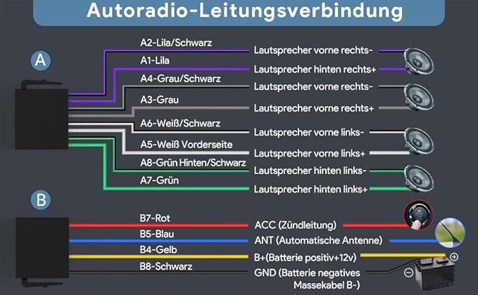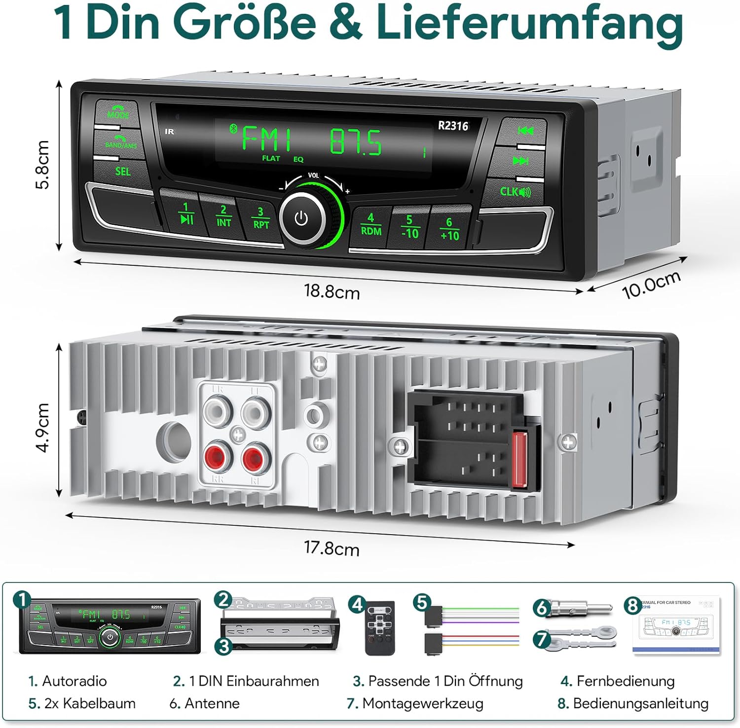 • Универсално 1 DIN радио за 12 V: С размери 18,8 x 10 x 5 см, това устройство е подходящо за почти всички стандартни 1 DIN табла на автомобили. Комплектът включва автомобилно радио, антена, съответстващ преден панел, дистанционно управление, ръководство, монтажна рамка, захранващ кабел и инструменти за монтаж. Забележка: Не е подходящо за автомобили с 24V захранване.