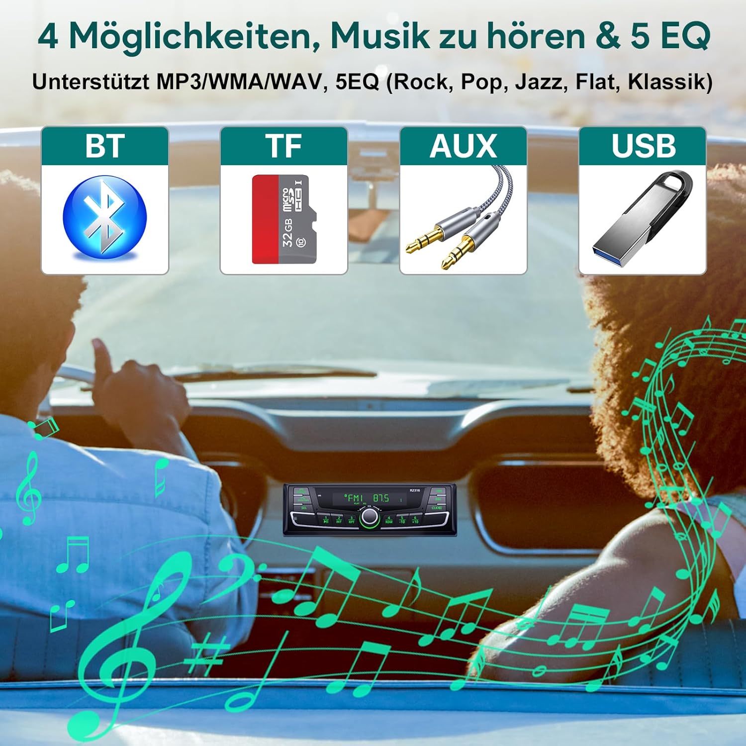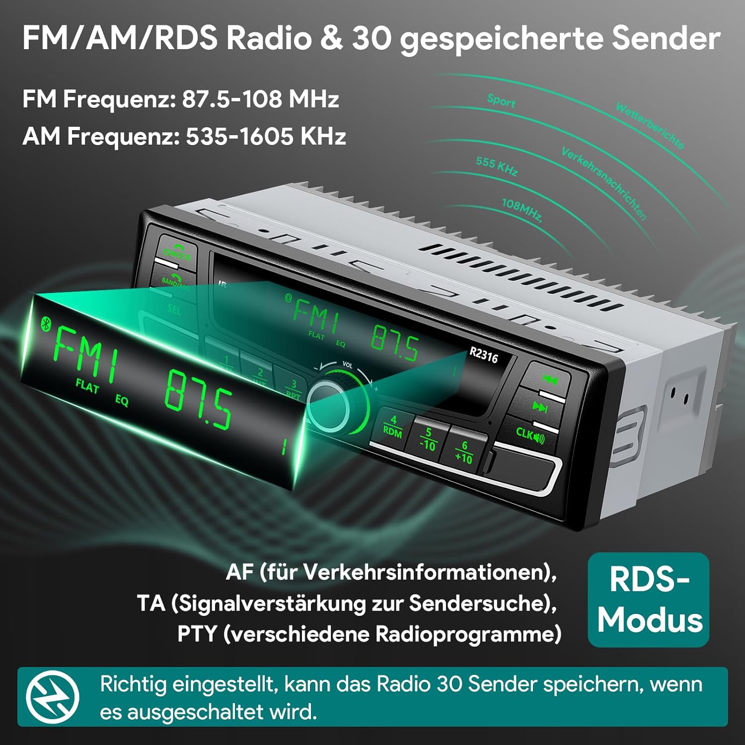 • 【AM/FM/RDS Bluetooth автомобилно радио】С това RDS Bluetooth автомобилно радио можете да приемате широка гама от радиостанции (FM: 87.5-107.9MHz, AM: 522-1620MHz), от съобщения за трафика до прогнози за времето и музикални програми и др. Освен това, можете да запазите до 30 от любимите си станции (AM: 12 станции, FM: 18 станции).