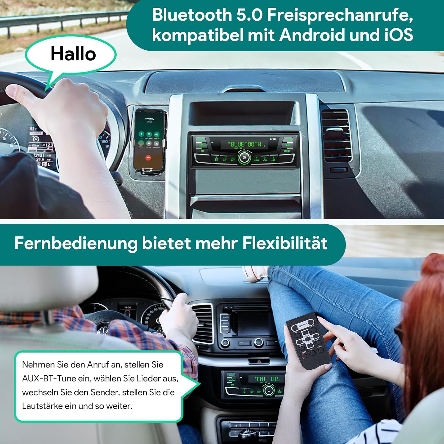 • Bluetooth 5.0 автомобилно радио с ръчно дистанционно управление: С мощност 65W x 4, това автомобилно радио е съвместимо с 12V превозни средства и може безпроблемно да се сдвои с Android и iOS. Осигурява гладки и стабилни връзки за работа със свободни ръце. Ръчното дистанционно управление на волана ви освобождава от фиксирано работно пространство, осигурява удобен достъп до силата на звука, радиостанциите, AUX и BT и по този начин повишава безопасността при шофиране.
