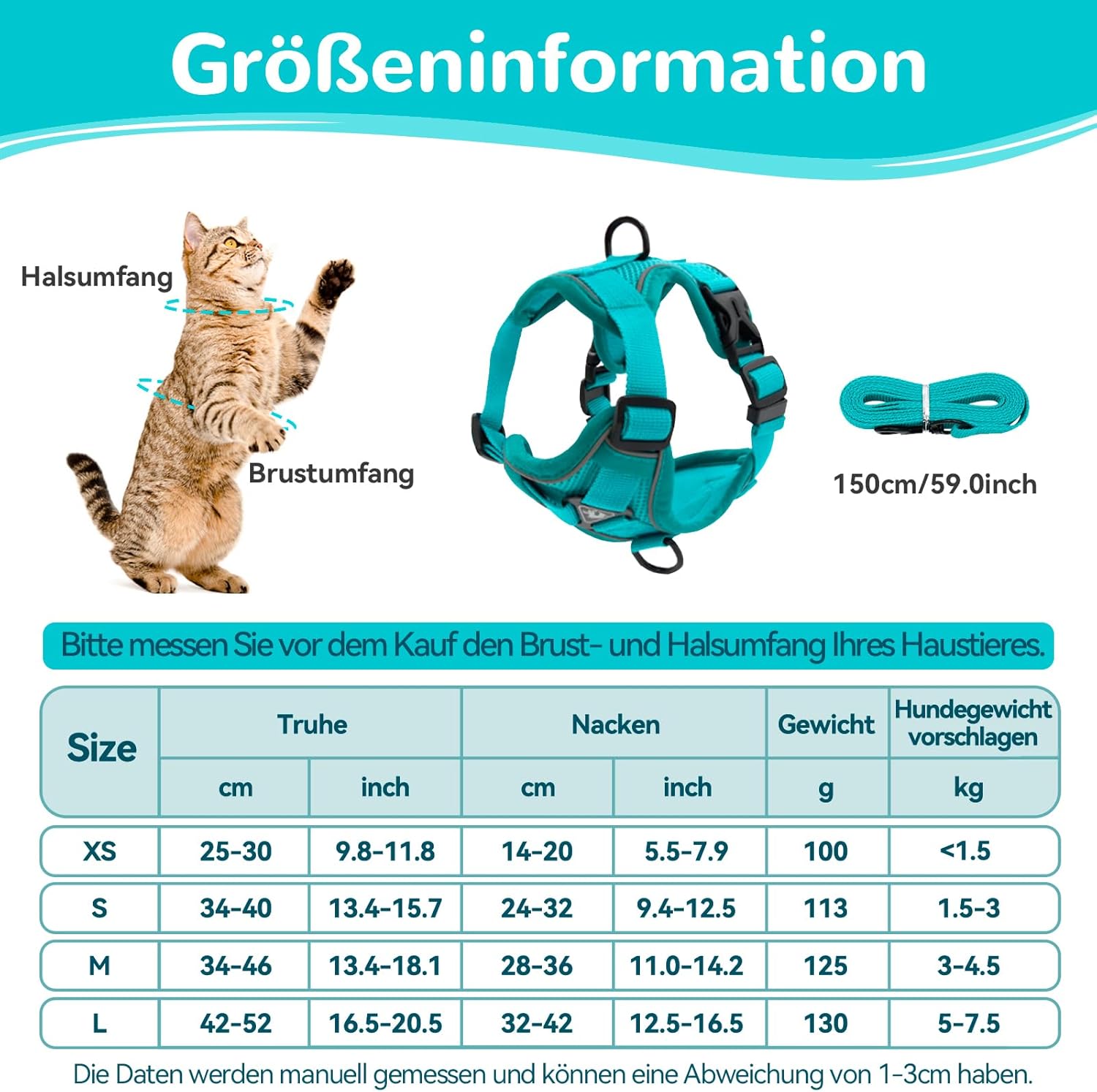 • Размер: Ще получите синьо морско яке размер M (гръдна обиколка: 34-40 см) с дължина на повода 1,5 метра. Моля, измерете внимателно гръдната обиколка на вашия домашен любимец преди покупка, за да си осигурите по-добро носене.