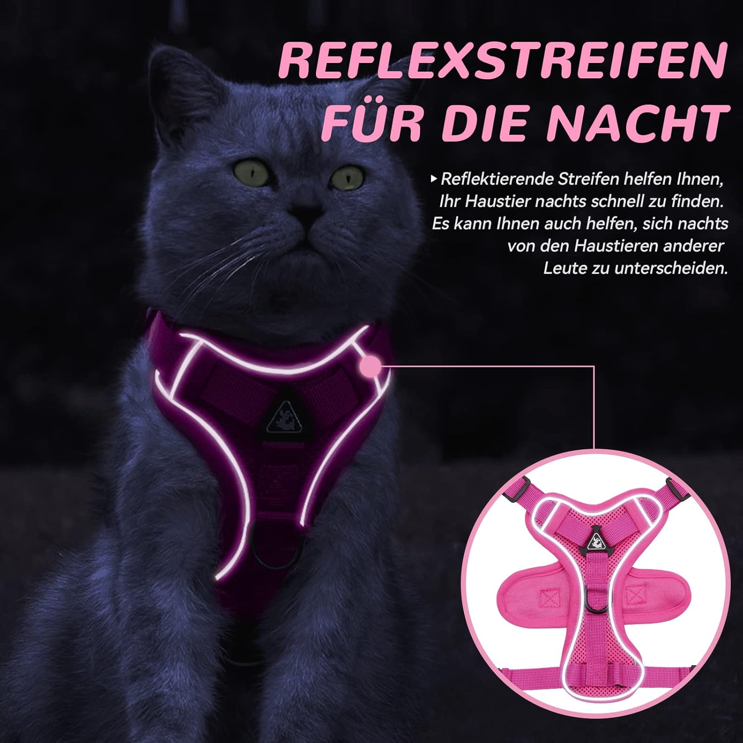 • Дизайн с отразяваща лента за околната среда: Дизайнът против бягство може да се регулира, за да се покаже отразяваща лента по ръба. Дизайнът с 360-градусов отразяващ дизайн прави котката по-забележима при условия на слаба светлина, осигурявайки безопасност през нощта.