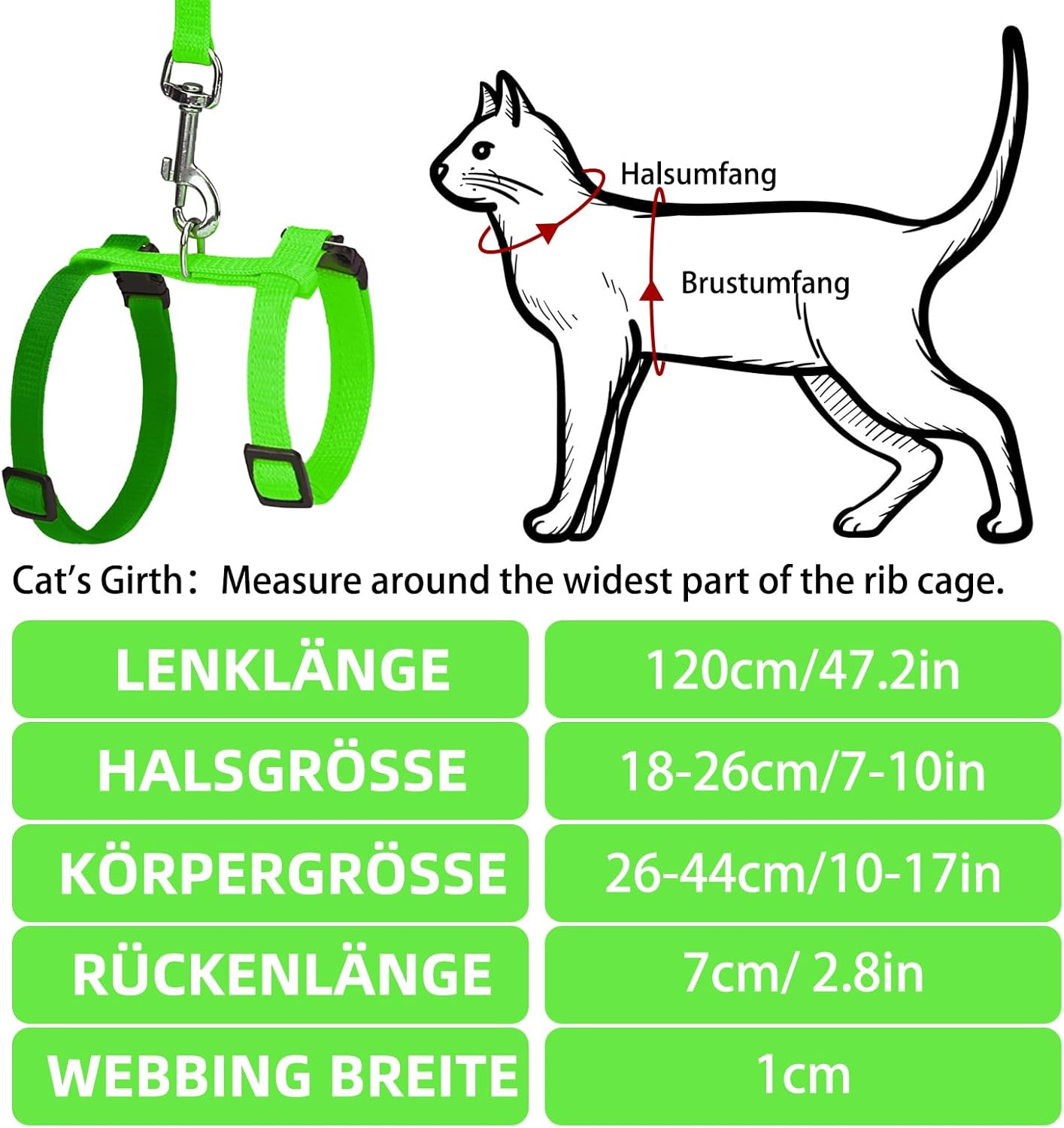 Обиколка на врата: регулируема от 18 см - 26 см, обиколка на гърдите: регулируема от 26 см - 44 см, дължина на каишката 120 см. Моля, измерете внимателно котката си и вижте таблицата с размери, преди да направите поръчка. На нагръдника има две катарами за заключване на гърдите и врата, което го прави много удобен за поставяне и сваляне. Не отнема много време да поставите и свалите котката си.