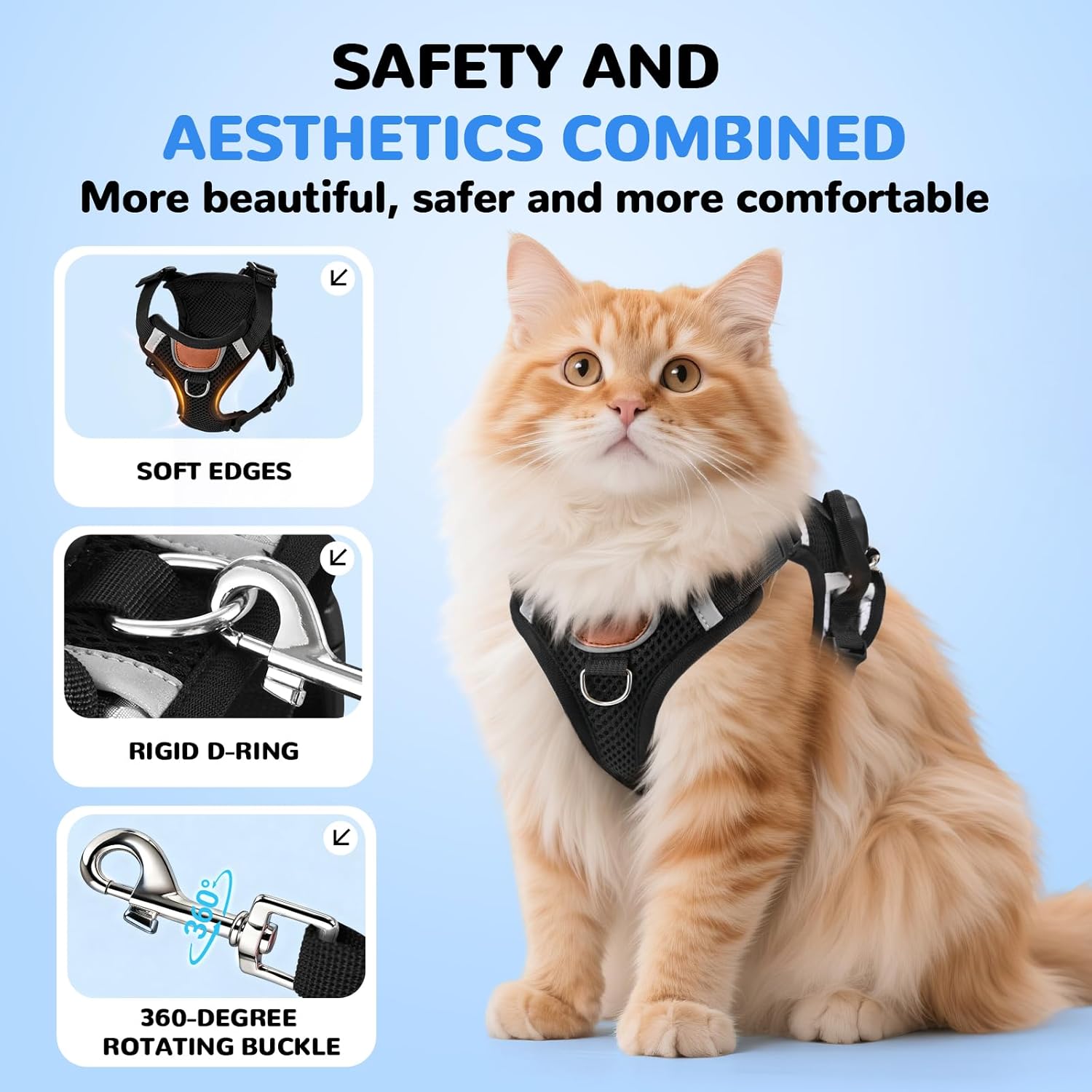 Този котешки нагръдник LUOJINYI е изработен от дишаща мрежеста материя и приляга удобно върху тялото на вашата котка благодарение на лекия си, мек материал, без да напряга кожата или козината. Прибиращият се повод с дължина 1,5 м осигурява безопасно и удобно бягане, като същевременно е нежен в ръката, без да причинява точки на натиск.