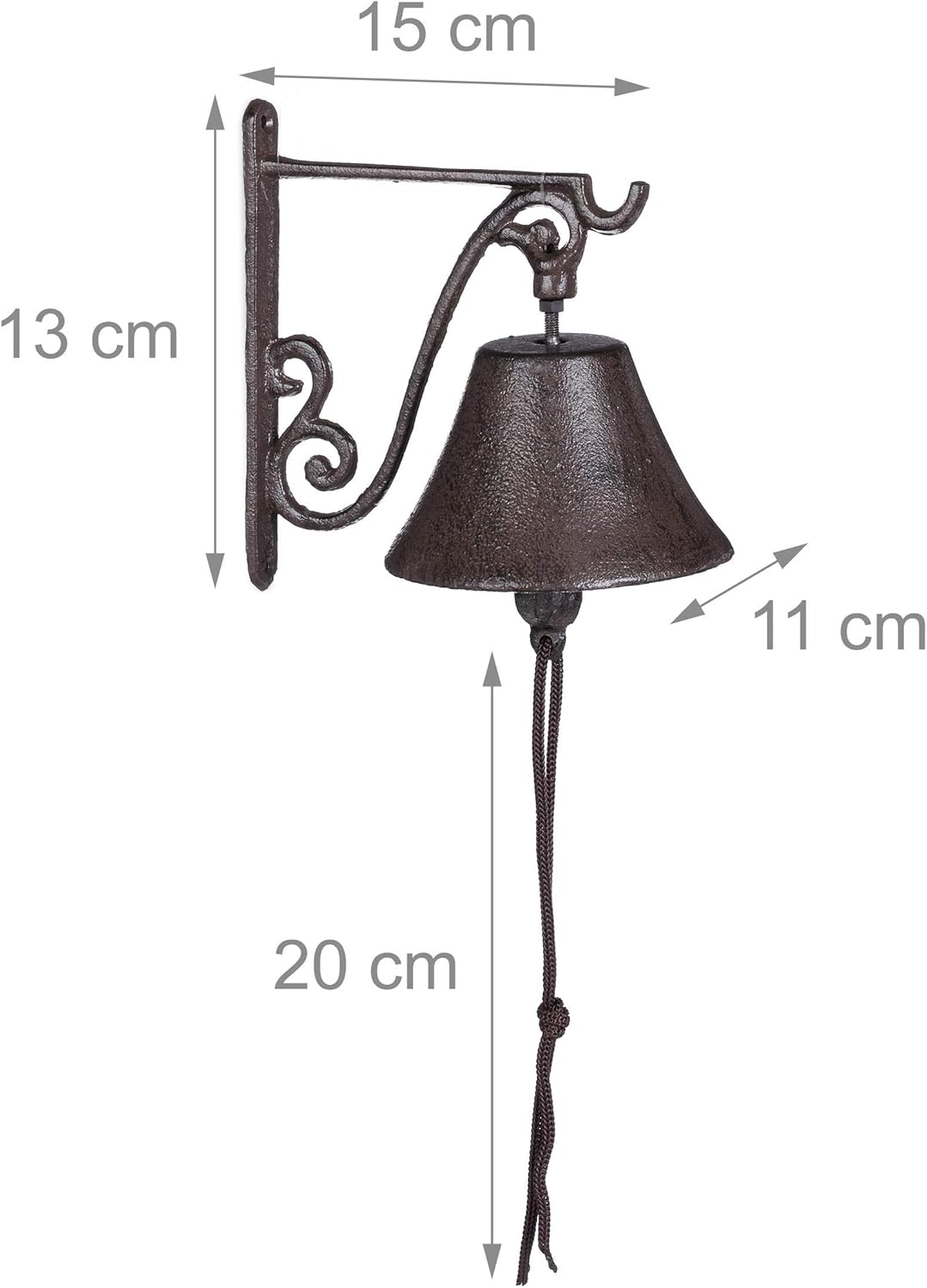Този чугунен звънец с античен дизайн украсява входната зона, вътрешния двор и градината. Монтиран на стената до вратата и портата, звънецът не само създава приветлива атмосфера, но със своя ярък и силен звън може да се използва и за призоваване на приятели и семейство. Железният звънец, в носталгичен селски стил, излъчва автентичен винтидж чар и украсява вашето външно пространство. Благодарение на двата предварително пробити отвора, устойчивият на атмосферни влияния метален звънец е лесен за монтаж.