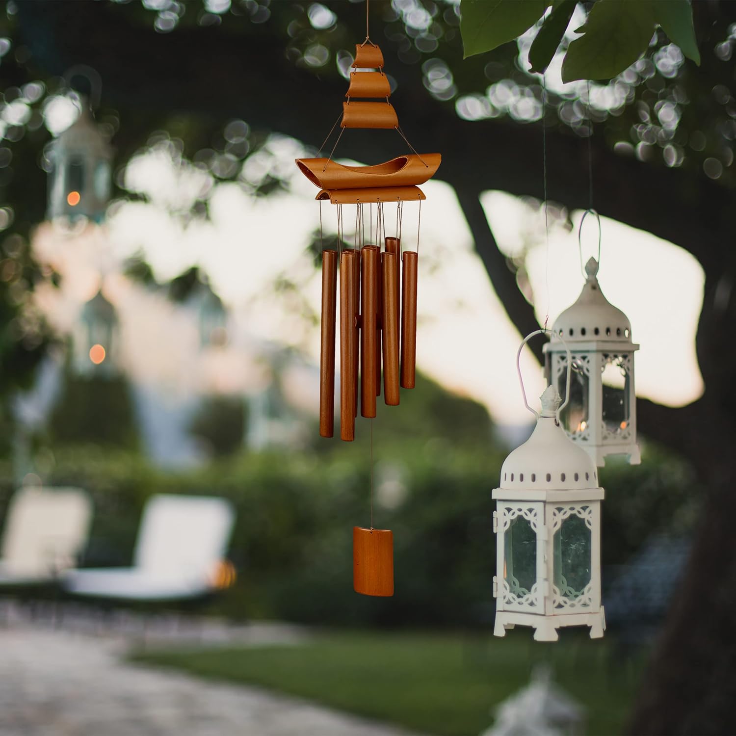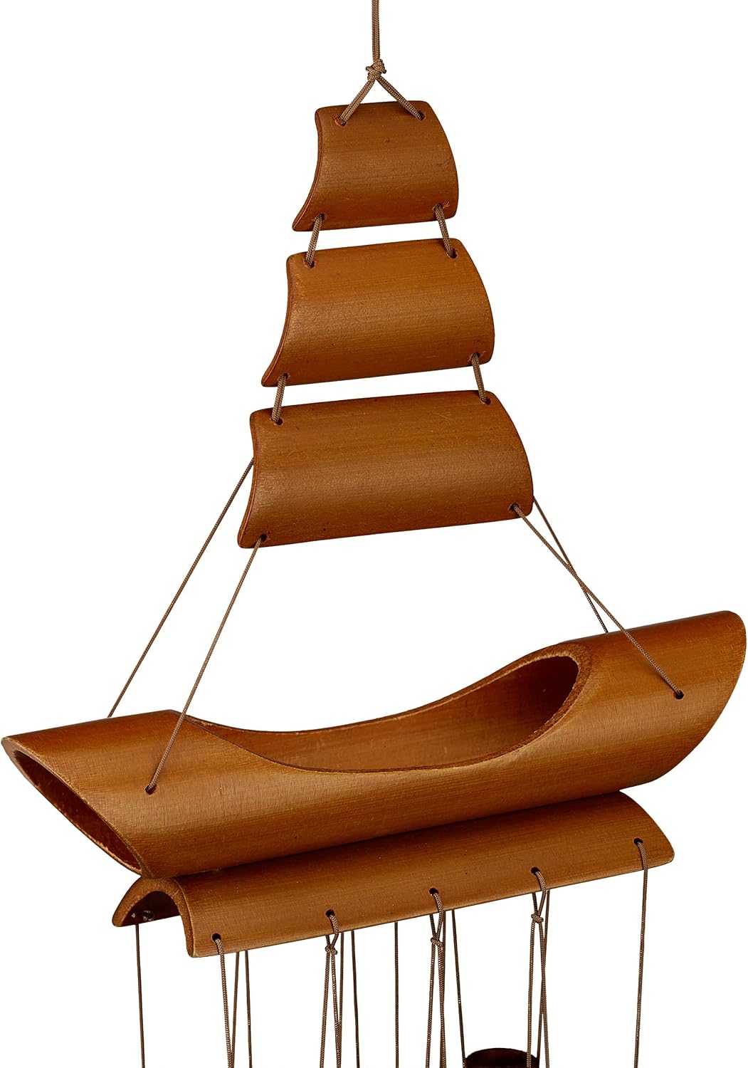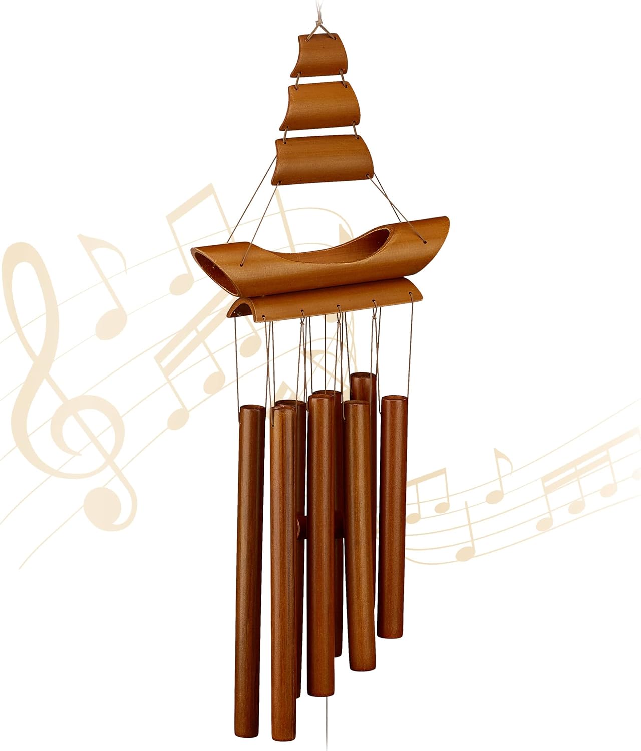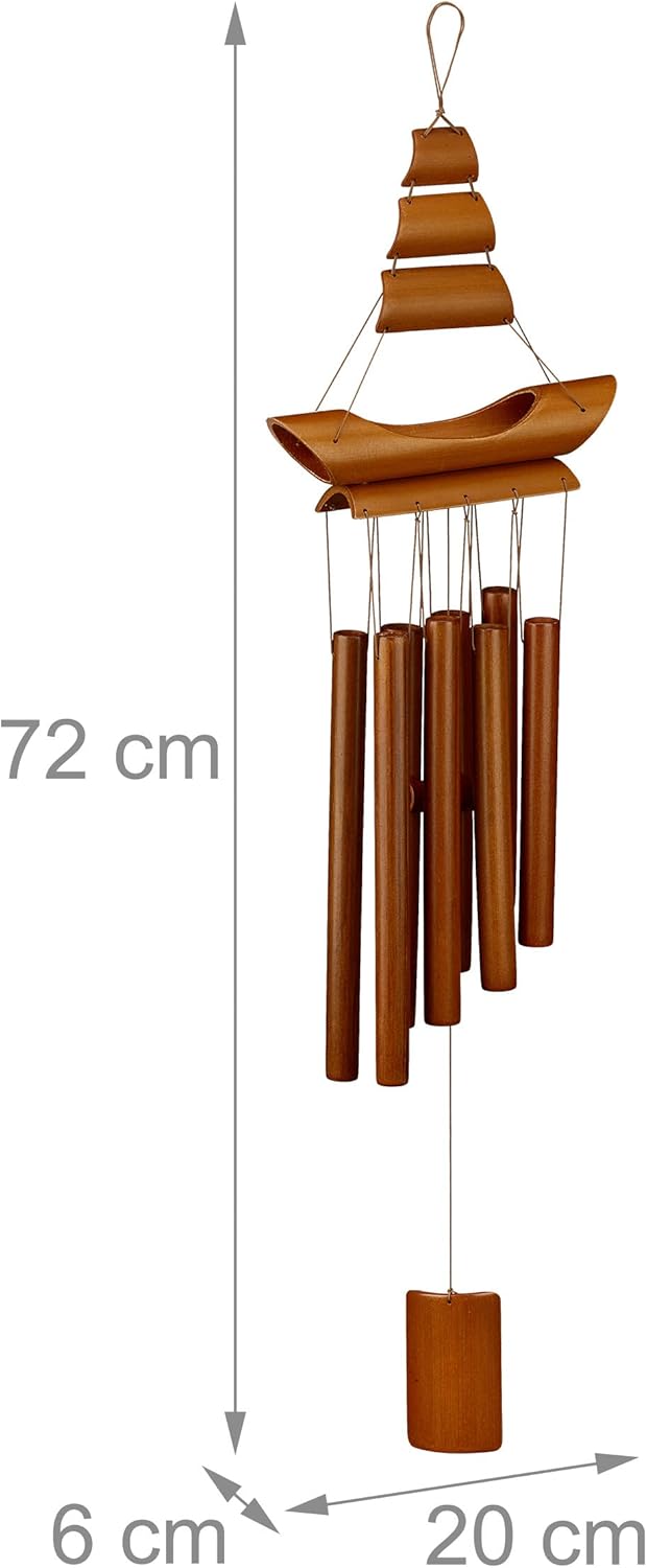Бамбуковият звънец с дизайн на платноходка с осем тръби, разположени в два реда, не само изглежда декоративно, но и издава топъл, успокояващ звук, докато парчетата нежно звънят една в друга на вятъра. Окачен на балкона, терасата или в градината, звънецът създава приятен фонов шум и релаксираща атмосфера по фън шуй. Звънецът е чудесна висяща декорация на закрито, красиво изложен близо до прозорци и особено пленява любителите на азиатското изкуство.