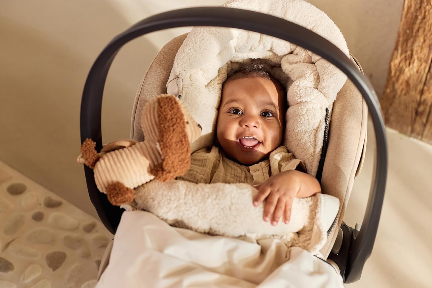 Играчка за количка за кучета Диего: Тази очарователна играчка за количка за кучета Диего е изработена от мека оребрена материя в бисквитено кафяво и е с игриви букле детайли в кожено кафяво. Пластмасовият пръстен позволява лесно закрепване към количката. С бродираните си очи и нос от плат, тя е идеалният спътник за вашето мъниче в движение!