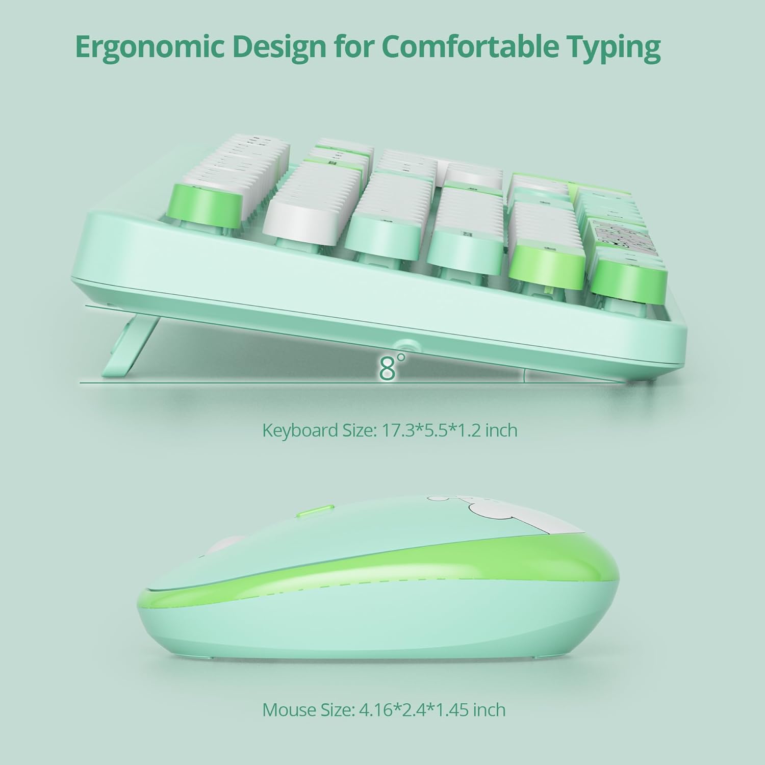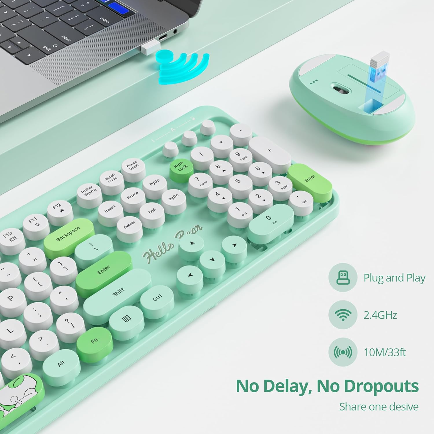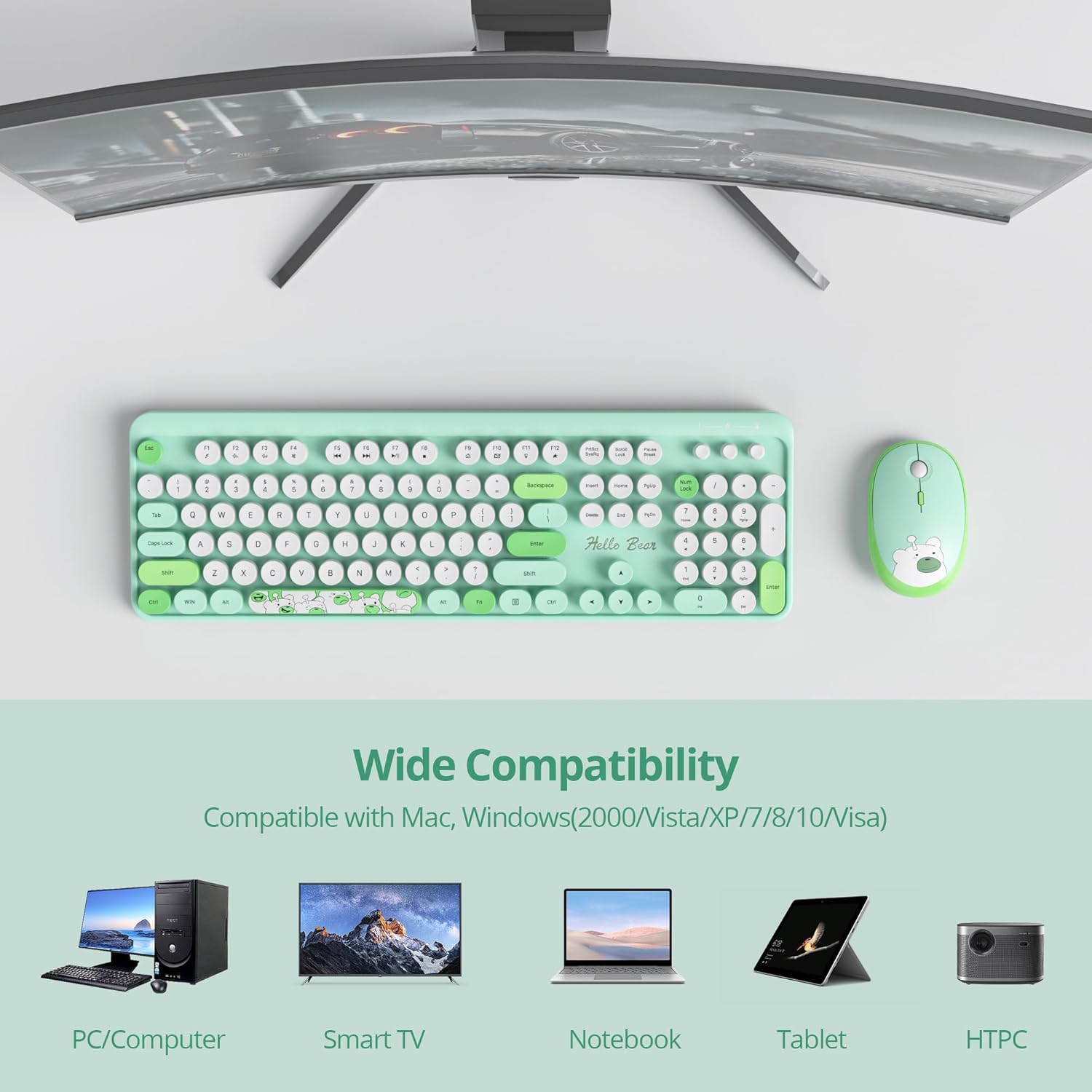 Ретро сладка безжична клавиатура и мишка, американска QWERTY, 104 клавиатура за пишеща машина в пълен размер с цифрова клавиатура, 2.4 GHz с кръгли клавиши за компютър, мечешко зелено
