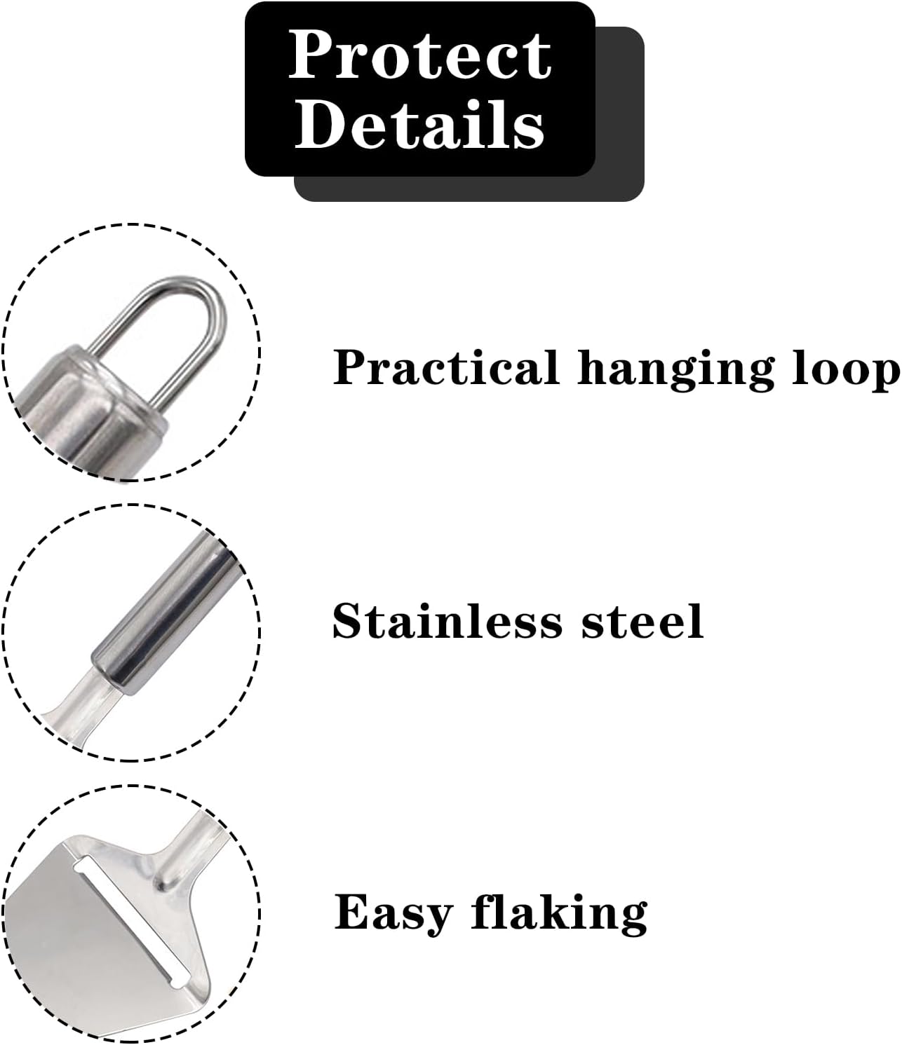 • 【Практичен дизайн】Резачката за сирене от неръждаема стомана е снабдена с удобни капси и може да се съхранява на парапета с помощта на кукички. Функционалните части са здраво закрепени към дръжката, осигурявайки допълнителна стабилност.