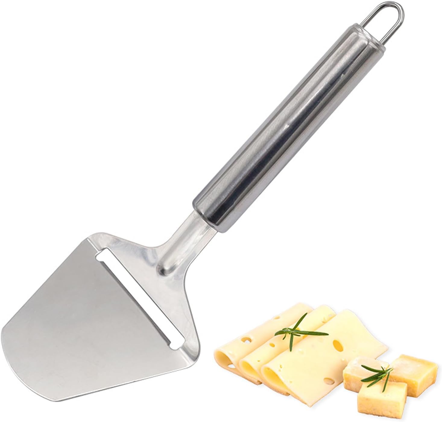 • 【Пакет】1 резачка за сирене от неръждаема стомана. Резачката за сирене има ергономична дръжка, която приляга удобно в ръката и ви позволява да режете тънки филийки твърдо и полутвърдо сирене.